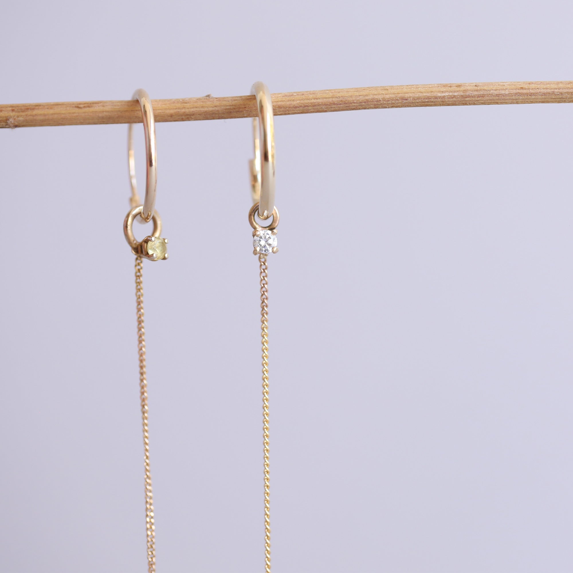 עגיל תנועתי, חישוק זהב עם יהלום לבן תלוי ושרשרת פאנצר זהב 14 קראט.