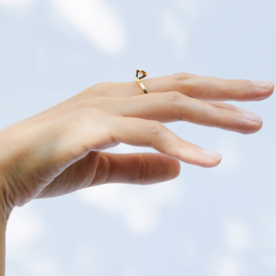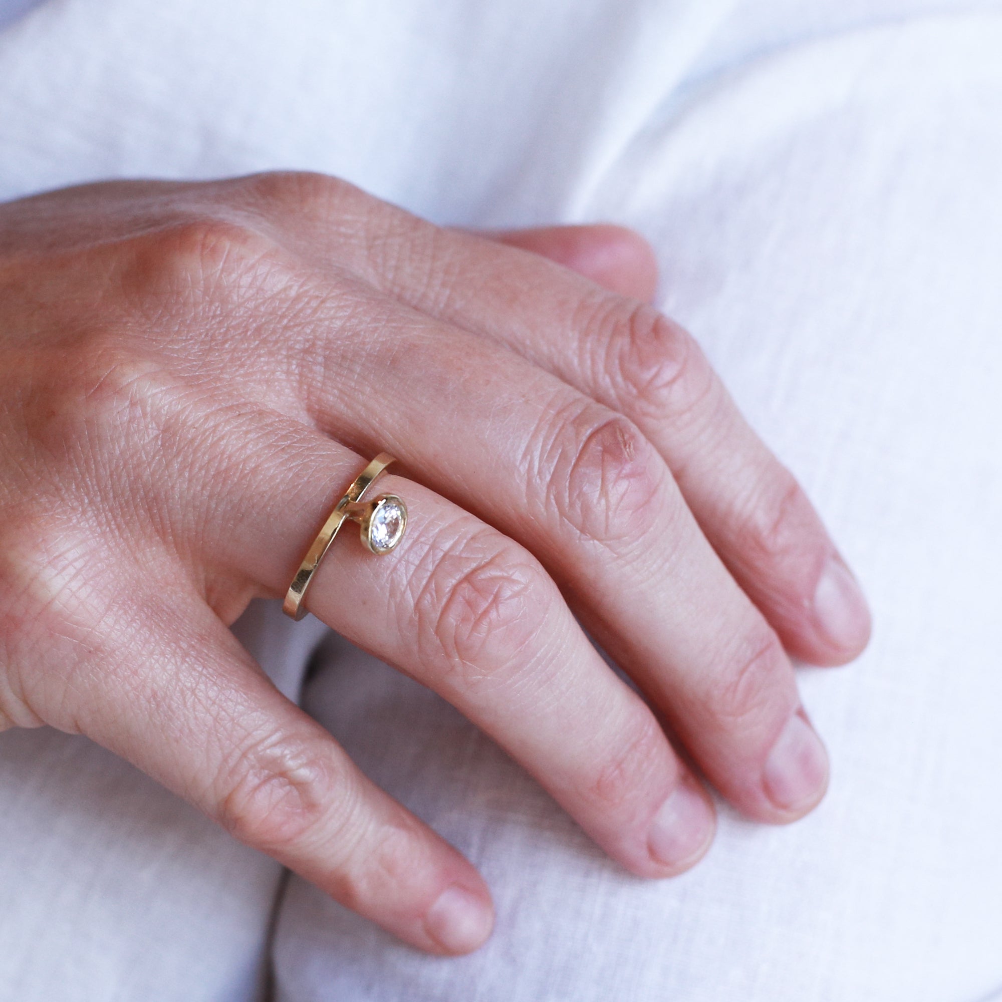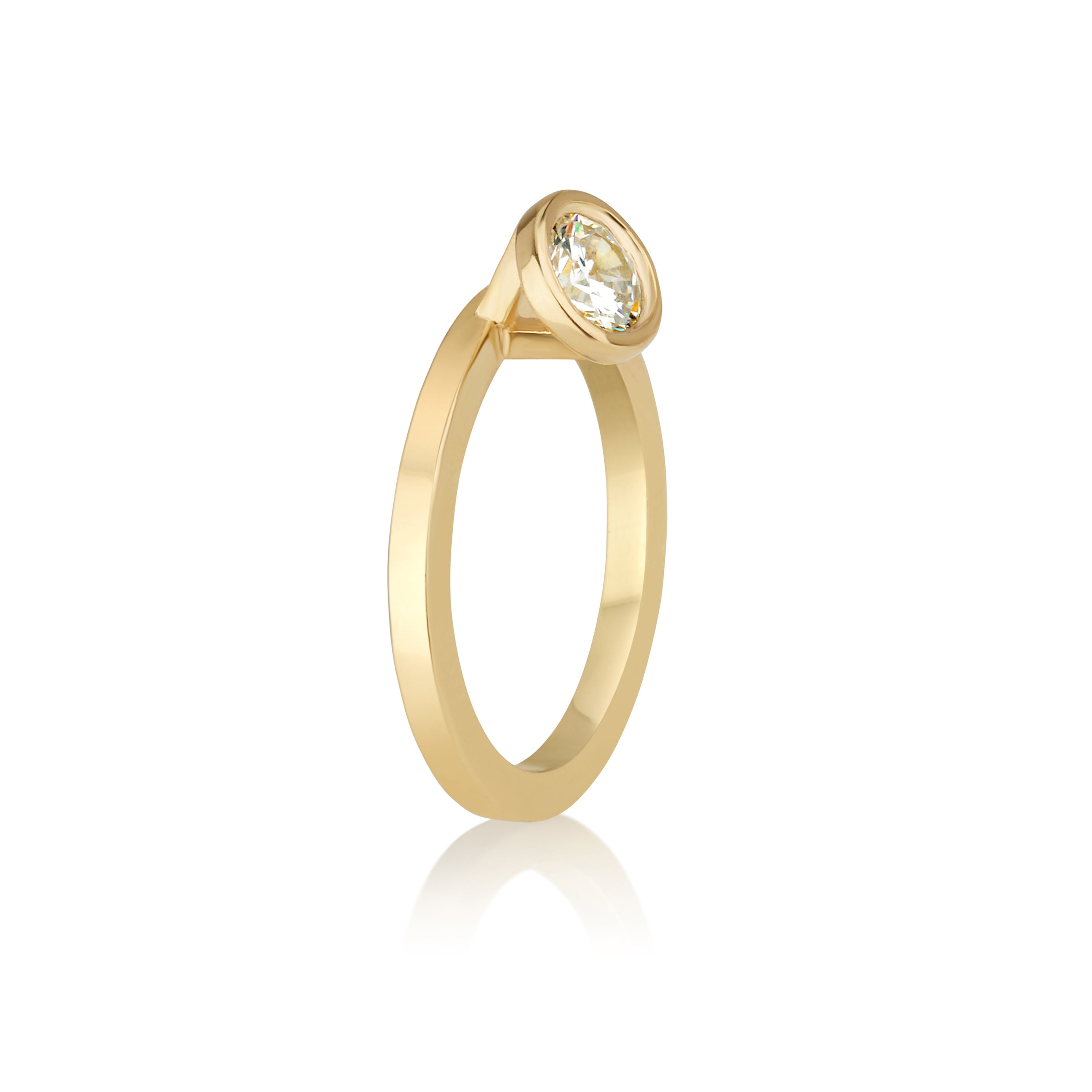 טבעת אירוסין גיאומטרית עם יהלום מרחף הממוקם בדיוק בראש הקונוס המוטה מעט באלכסון. טבעת אלגנטית המעוצבת בקפידה בעבודת יד. ניתנת לענידה בשני כיוונים.