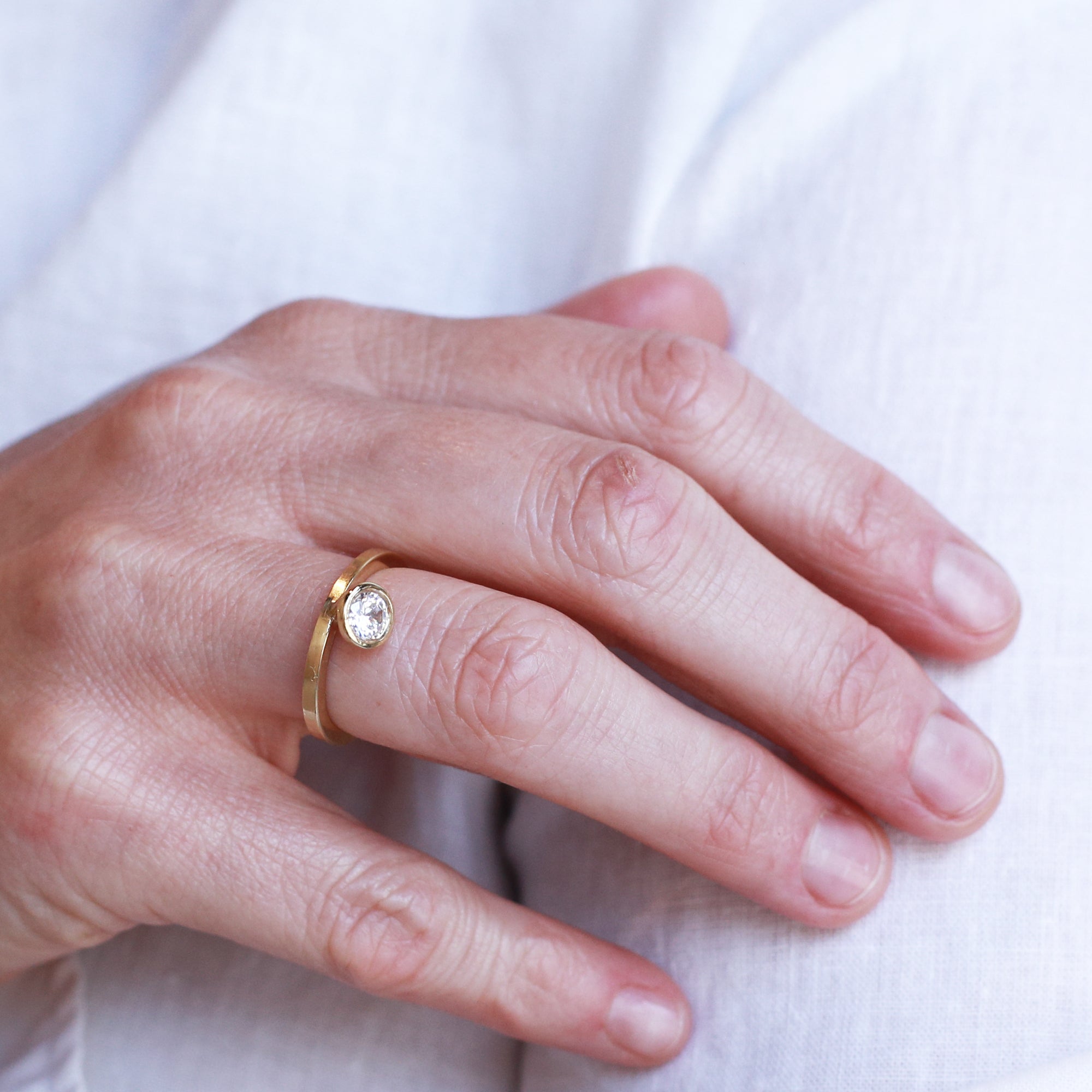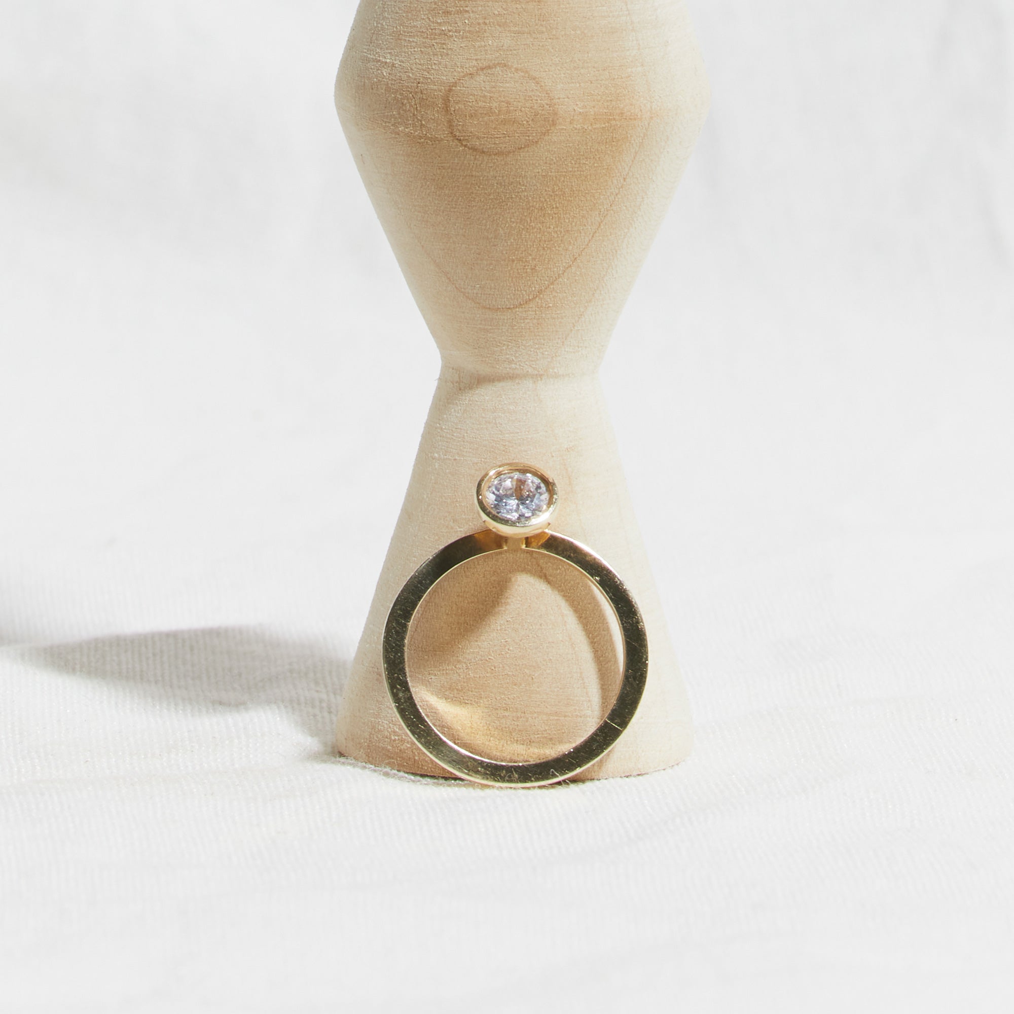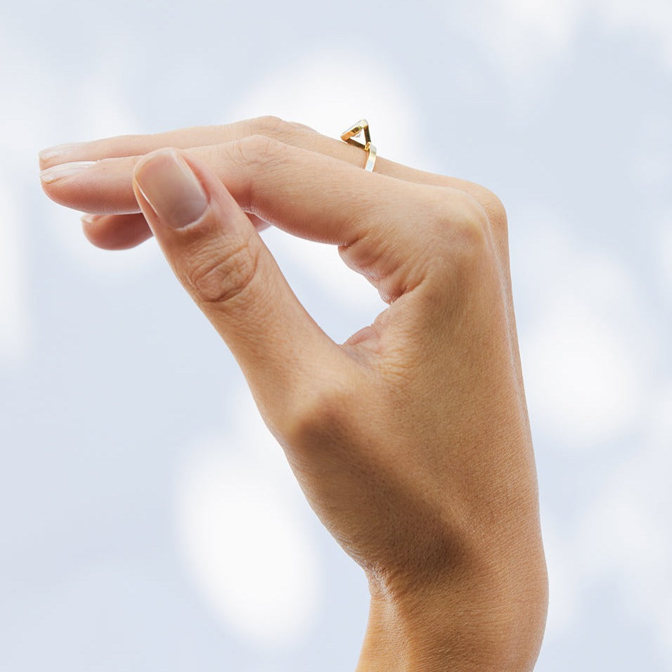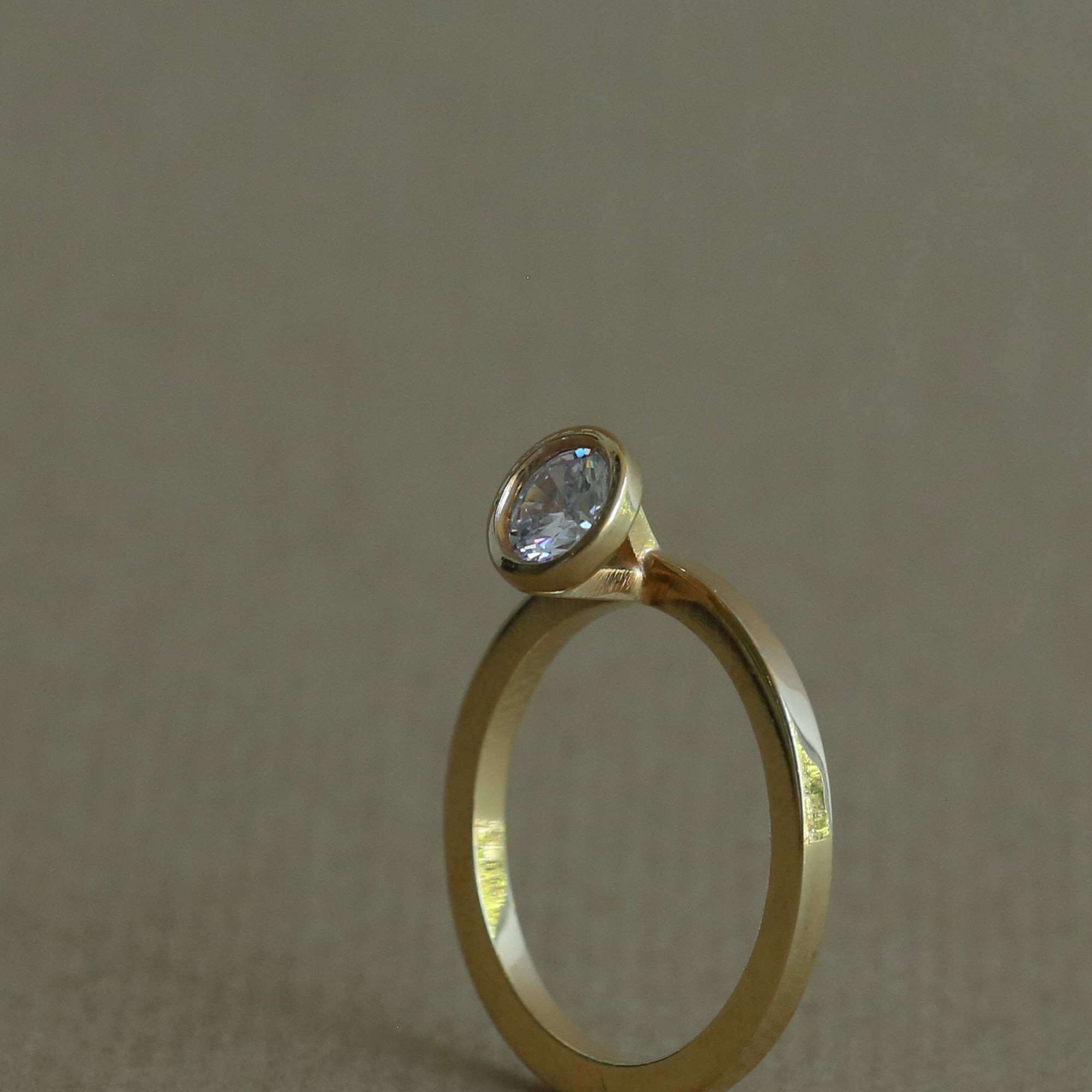 טבעת אירוסין גיאומטרית עם יהלום מרחף הממוקם בדיוק בראש הקונוס המוטה מעט באלכסון. טבעת אלגנטית המעוצבת בקפידה בעבודת יד. ניתנת לענידה בשני כיוונים.