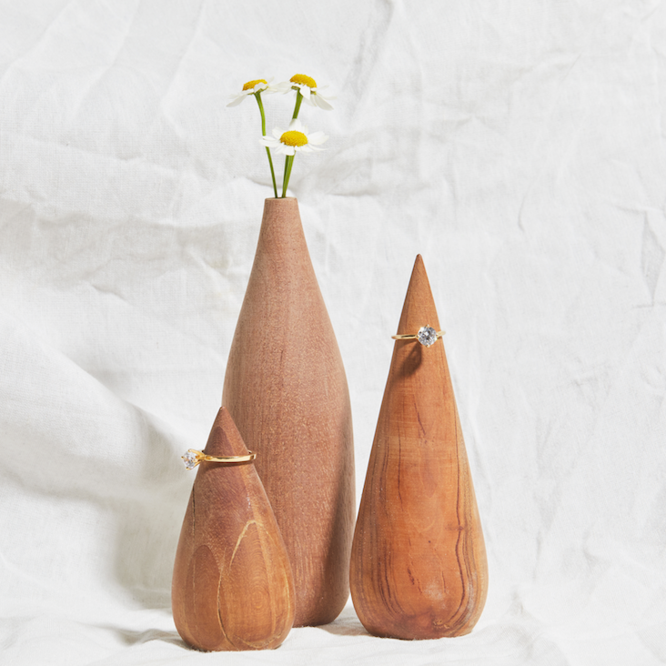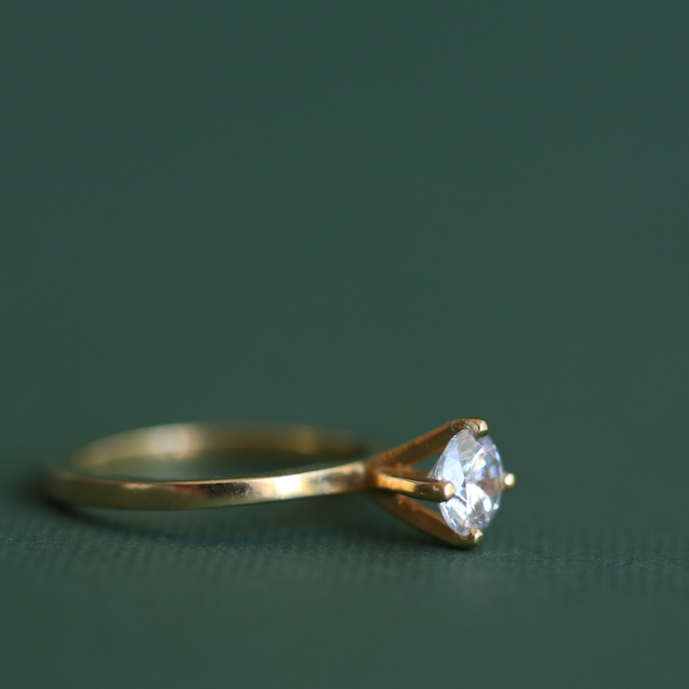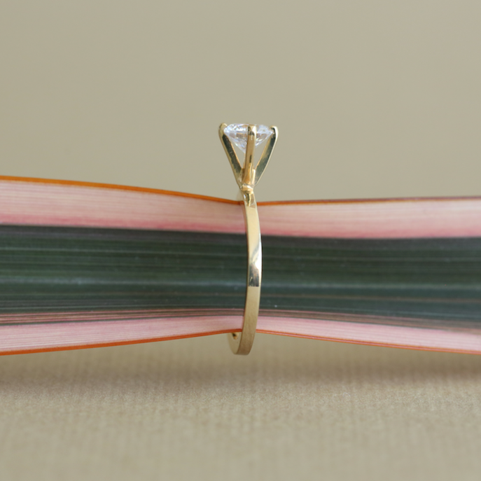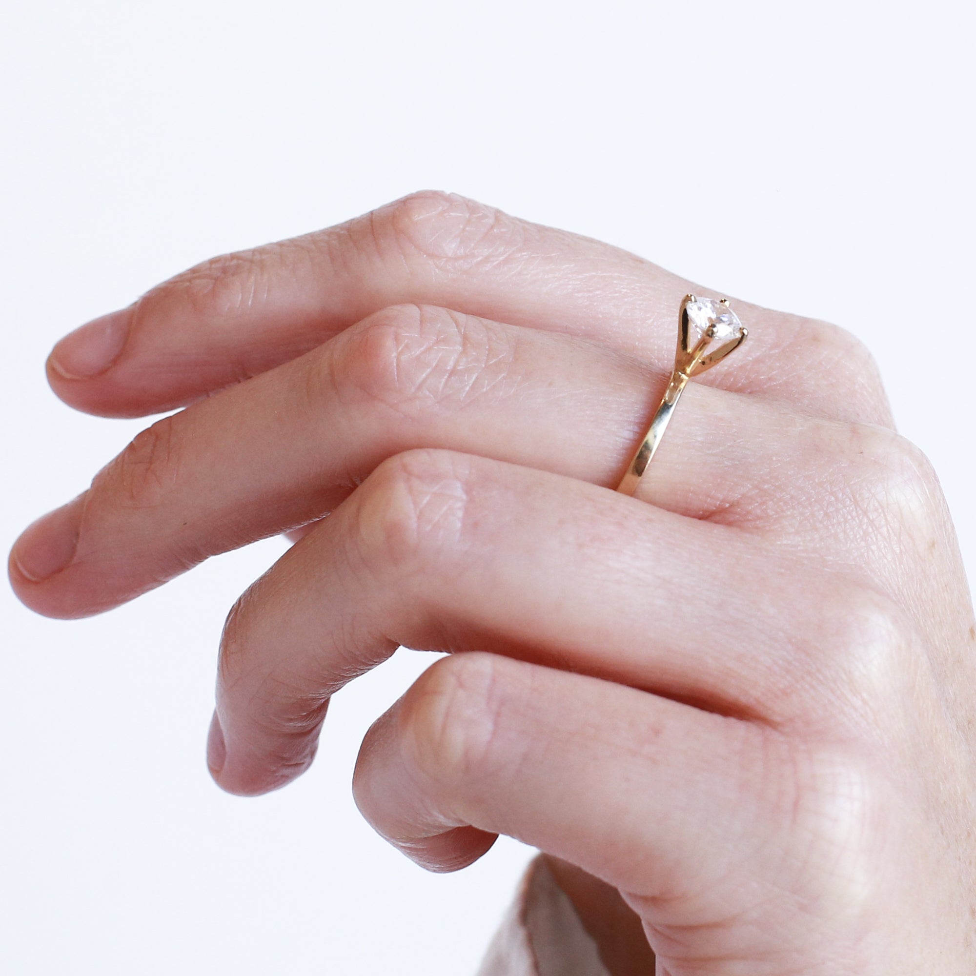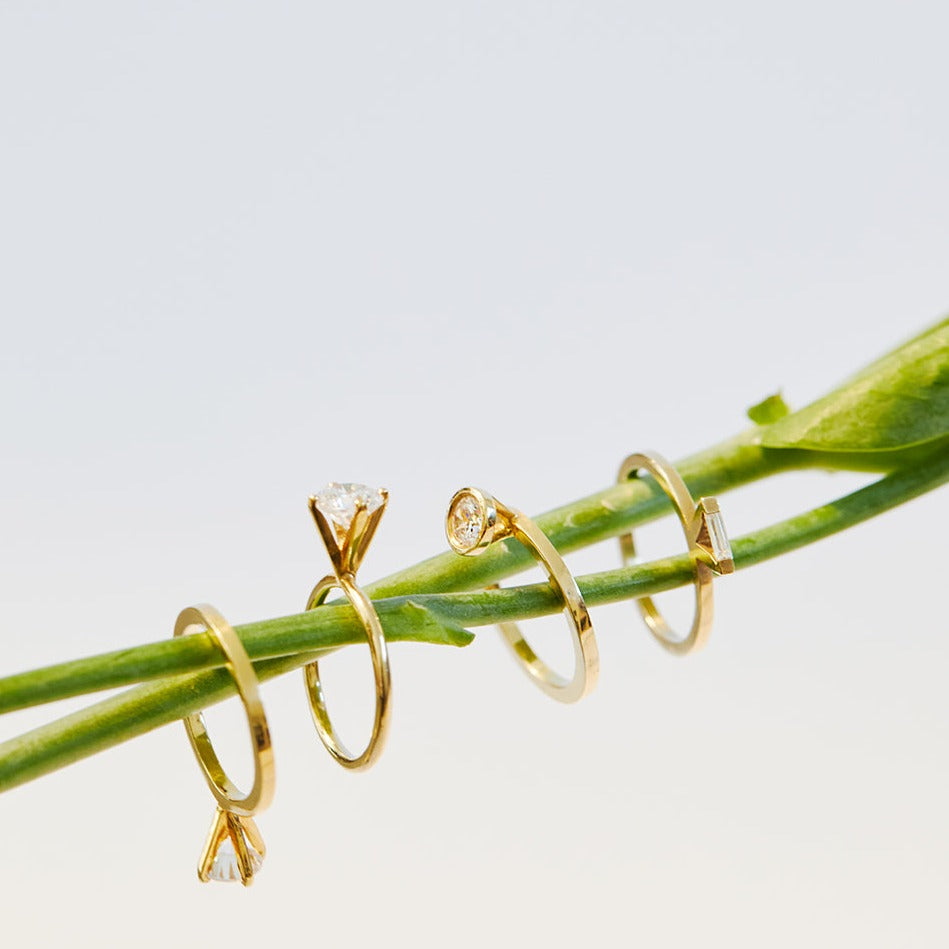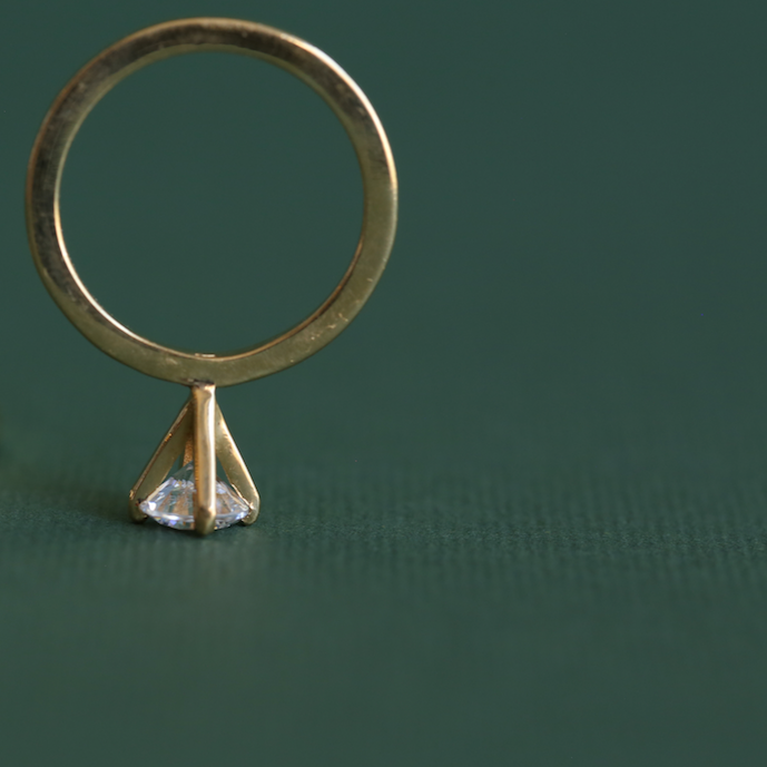 טבעת אירוסין גיאומטרית בצורת עץ עם יהלום מרחף המונח בין ענפי העץ. טבעת ייחודית ואלגנטית מעוצבת בקפידה בעבודת יד.