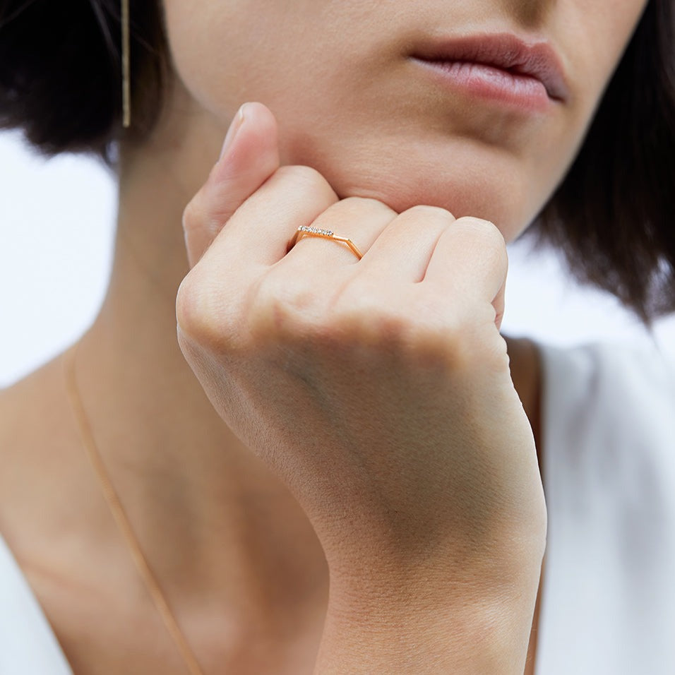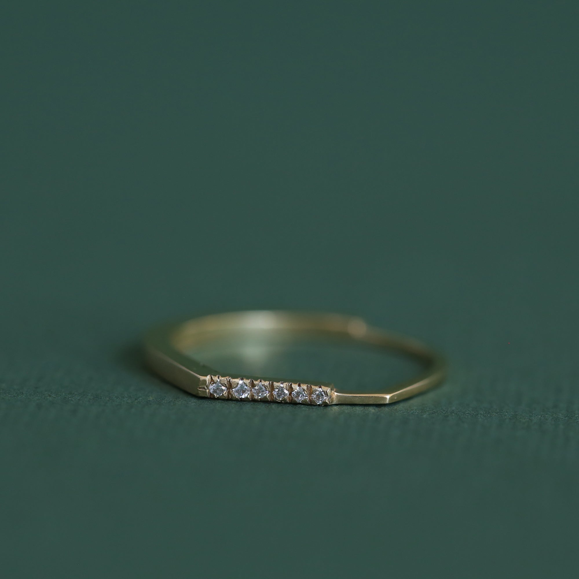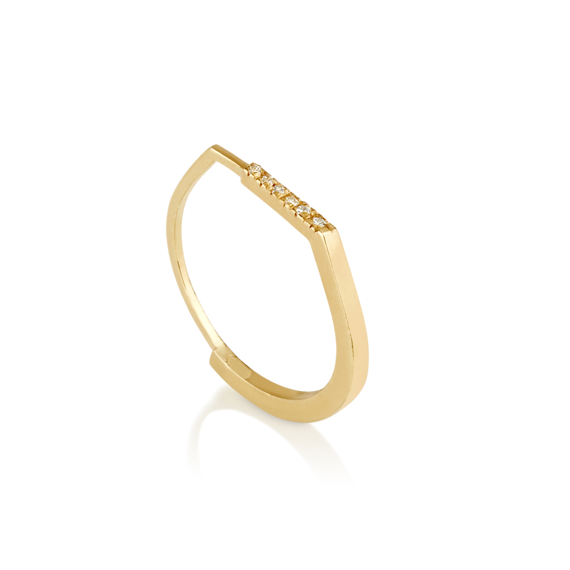 טבעת זהב גיאומטרית עדינה אסימטרית עם פס יהלומים בפרופיל מרובע. טבעת אלגנטית המעוצבת בקפידה בעבודת יד. מושלמת עם טבעת זהה נוספת.