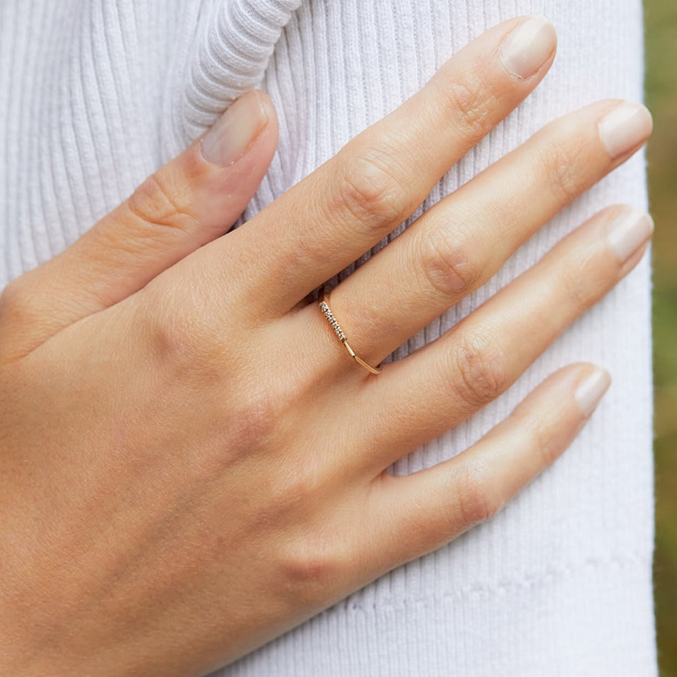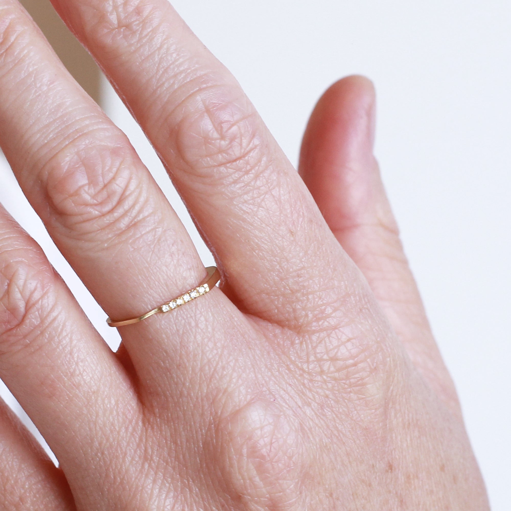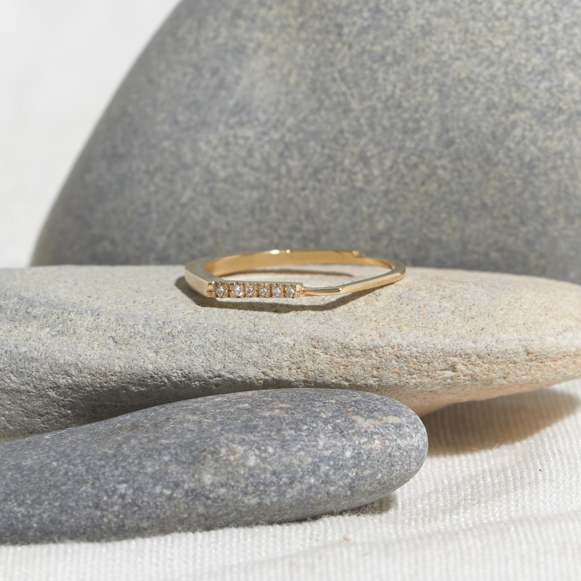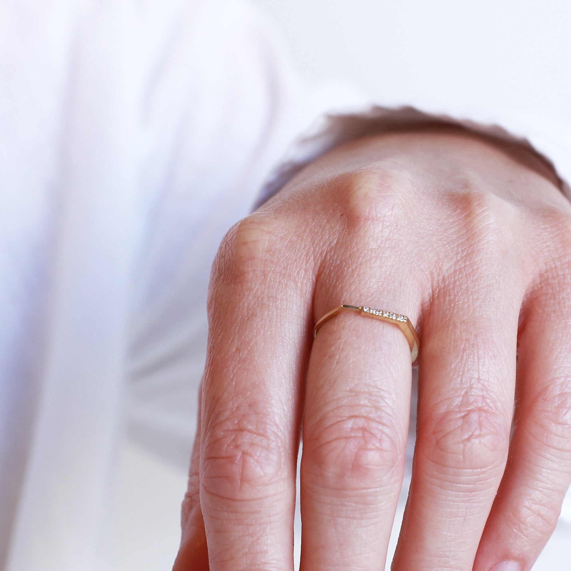 טבעת זהב גיאומטרית עדינה אסימטרית עם פס יהלומים בפרופיל מרובע. טבעת אלגנטית המעוצבת בקפידה בעבודת יד. מושלמת עם טבעת זהה נוספת.