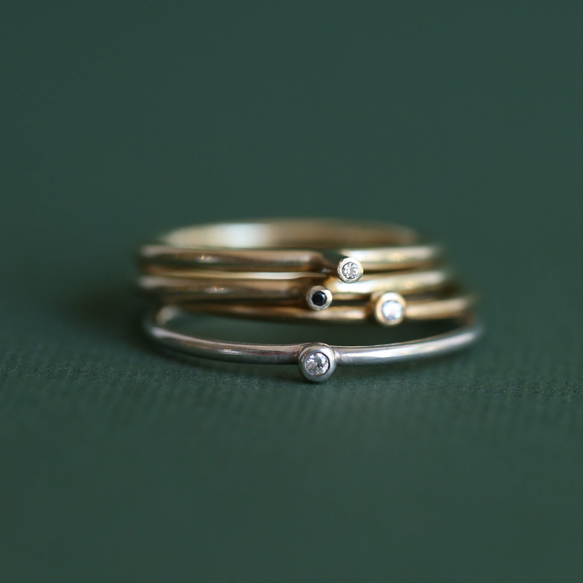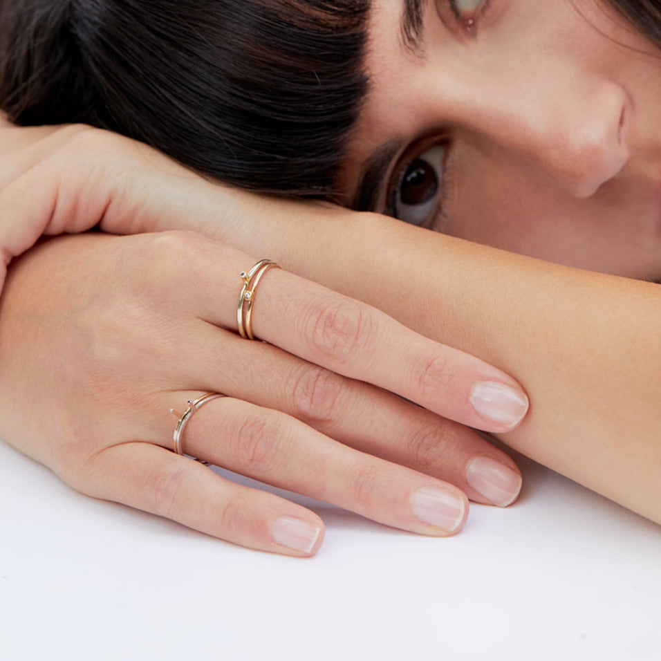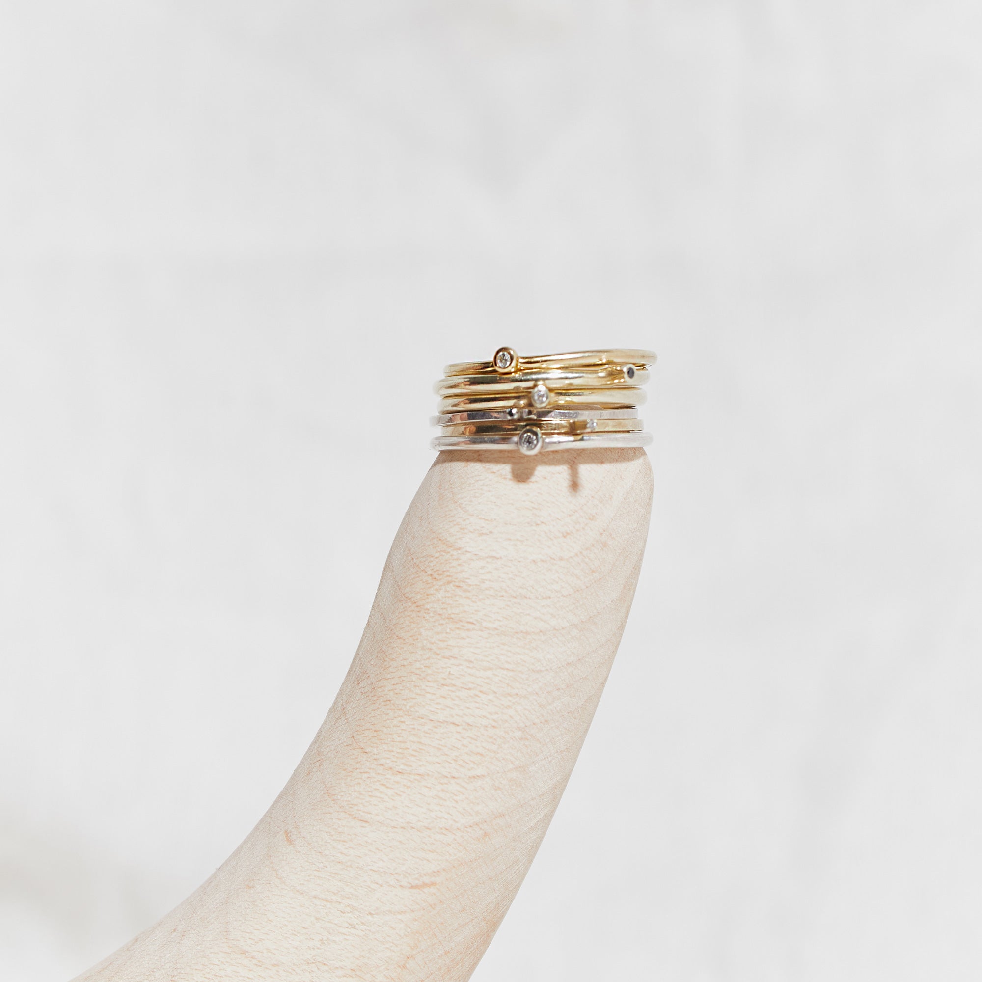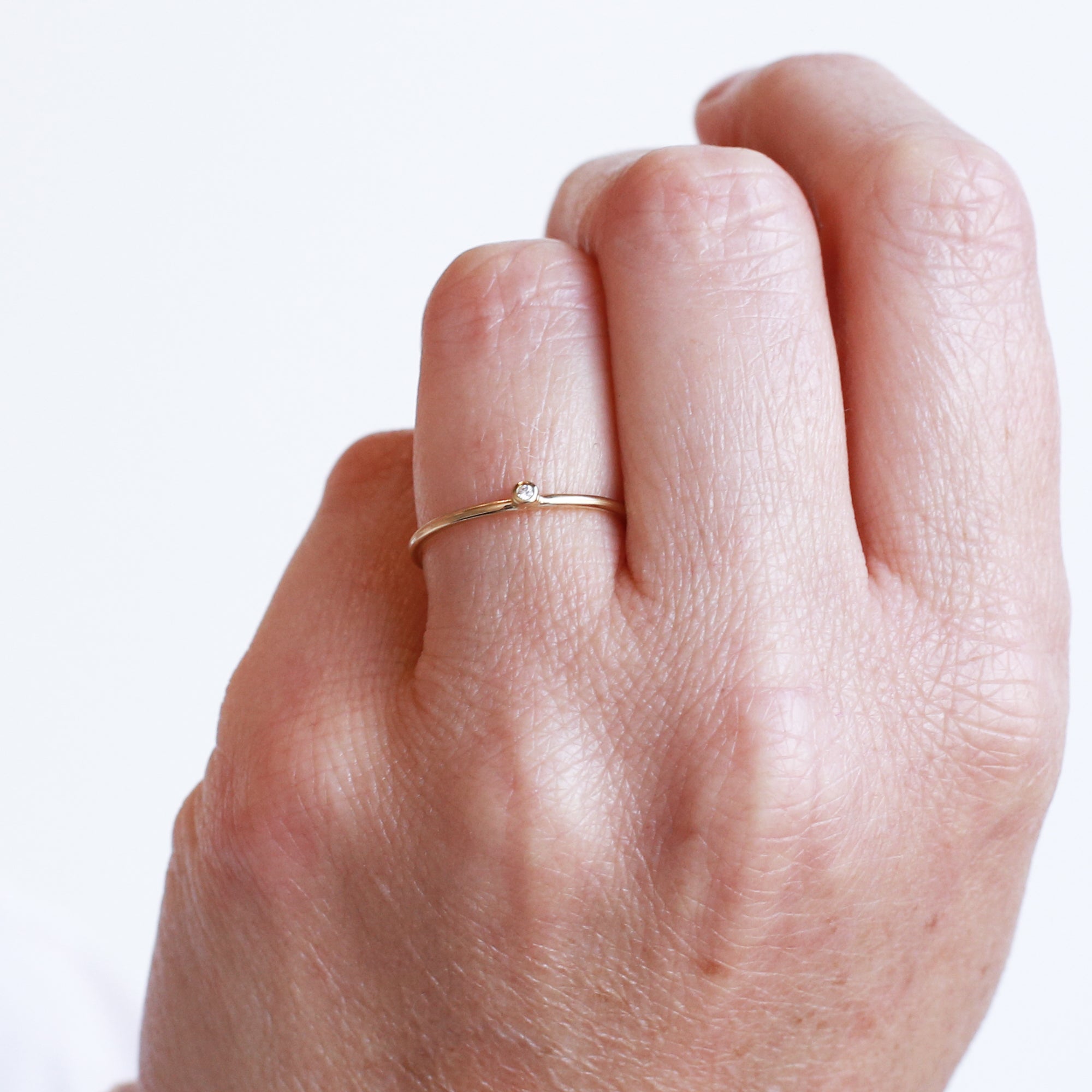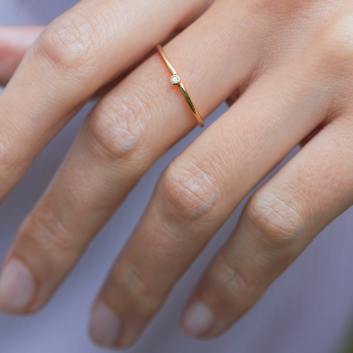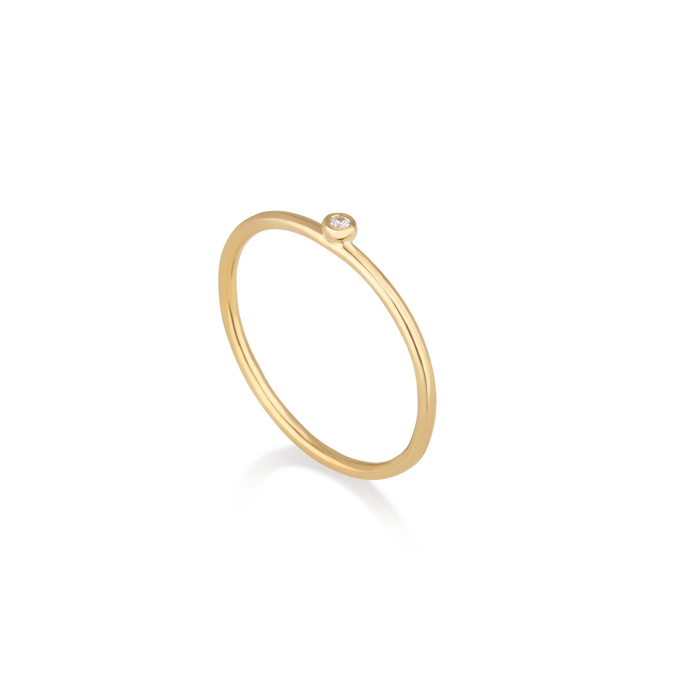 טבעת זהב עדינה עם נקודת יהלום בפרופיל עגול. טבעת אלגנטית המעוצבת בקפידה בעבודת יד. מושלמת עם טבעות זהות נוספות.