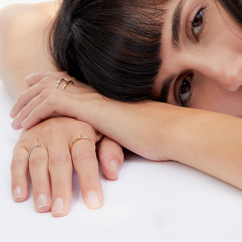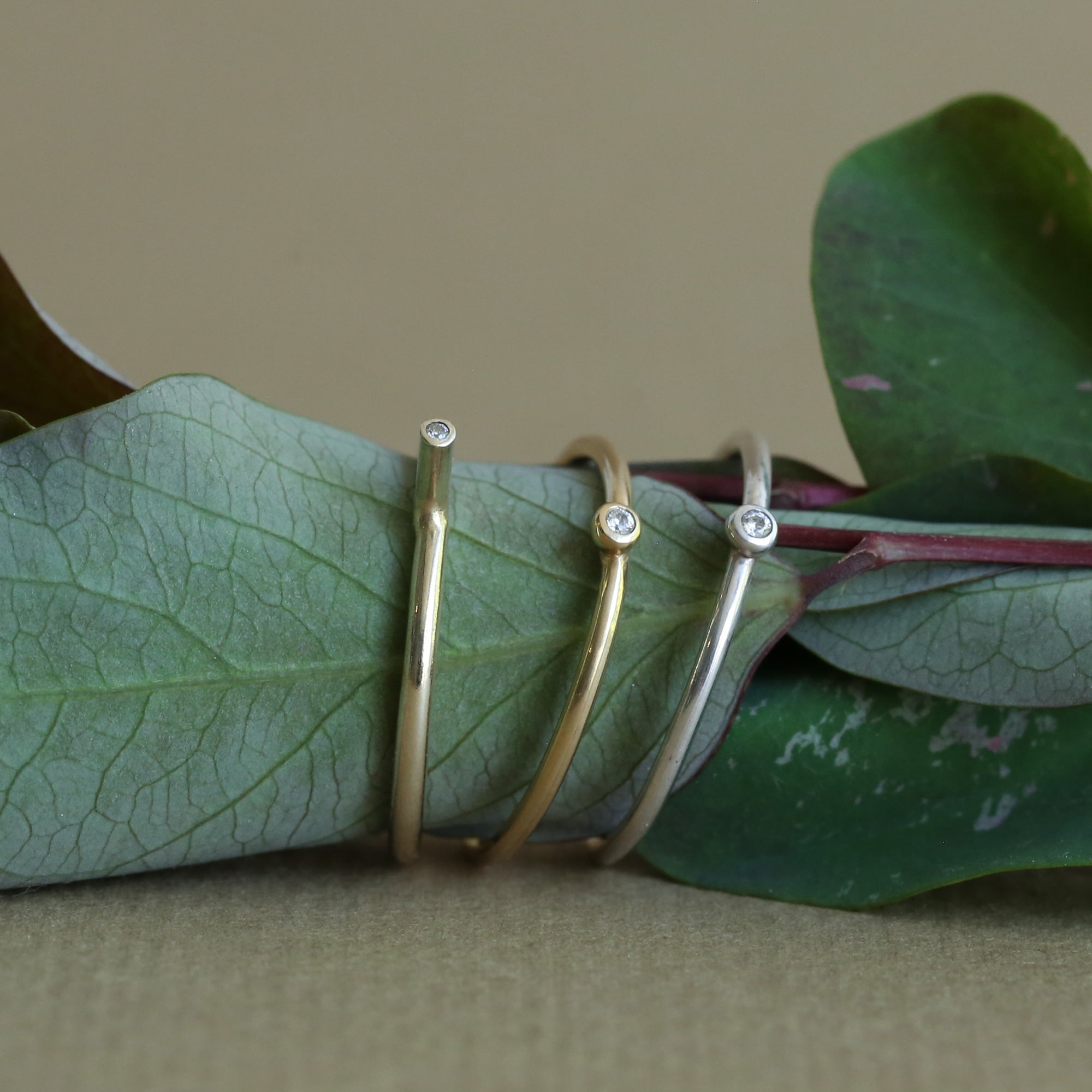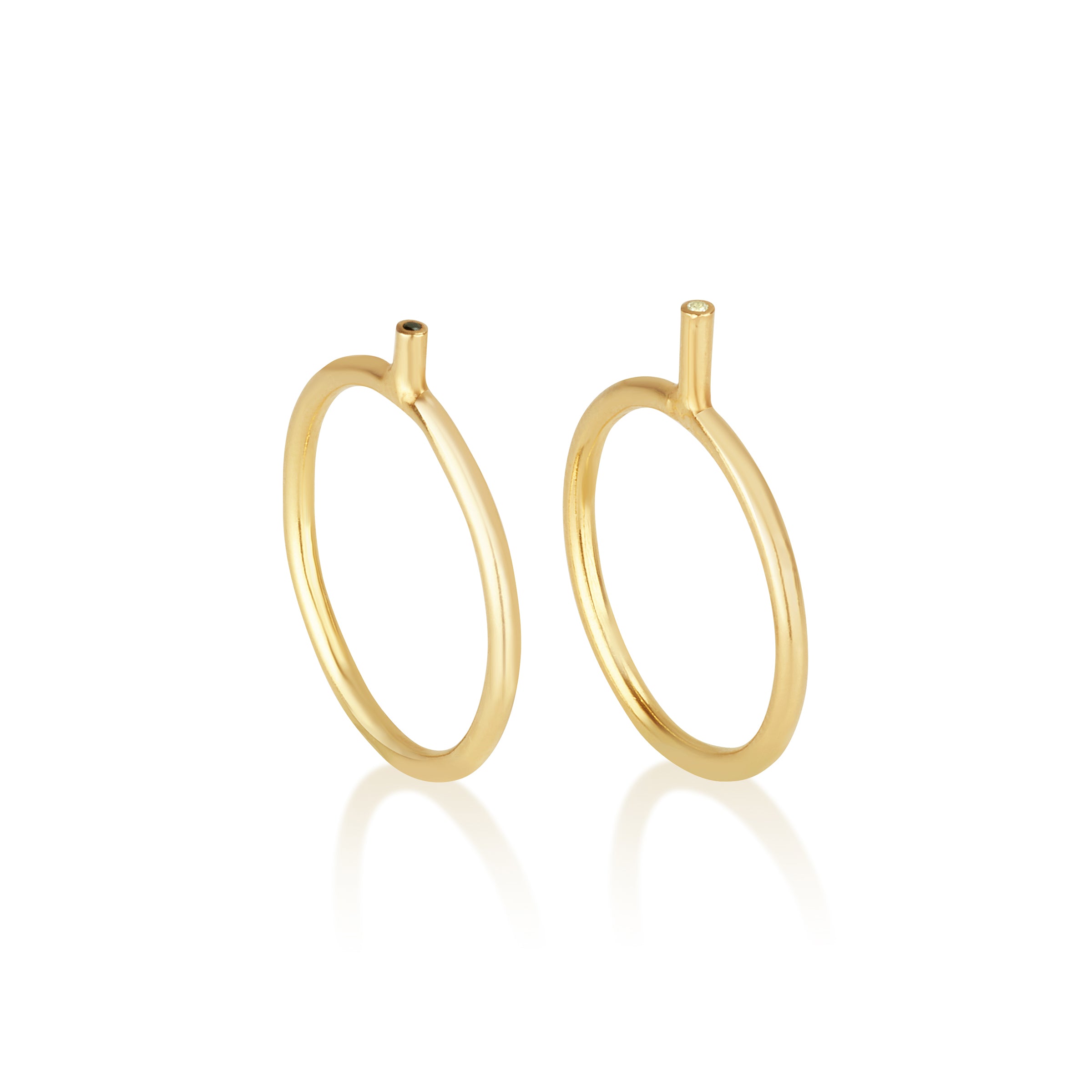 טבעות זהב עדינות עם נקודת יהלום מוגבהת בפרופיל עגול, טבעת אחת עם יהלום לבן והשניה עם יהלום שחור.