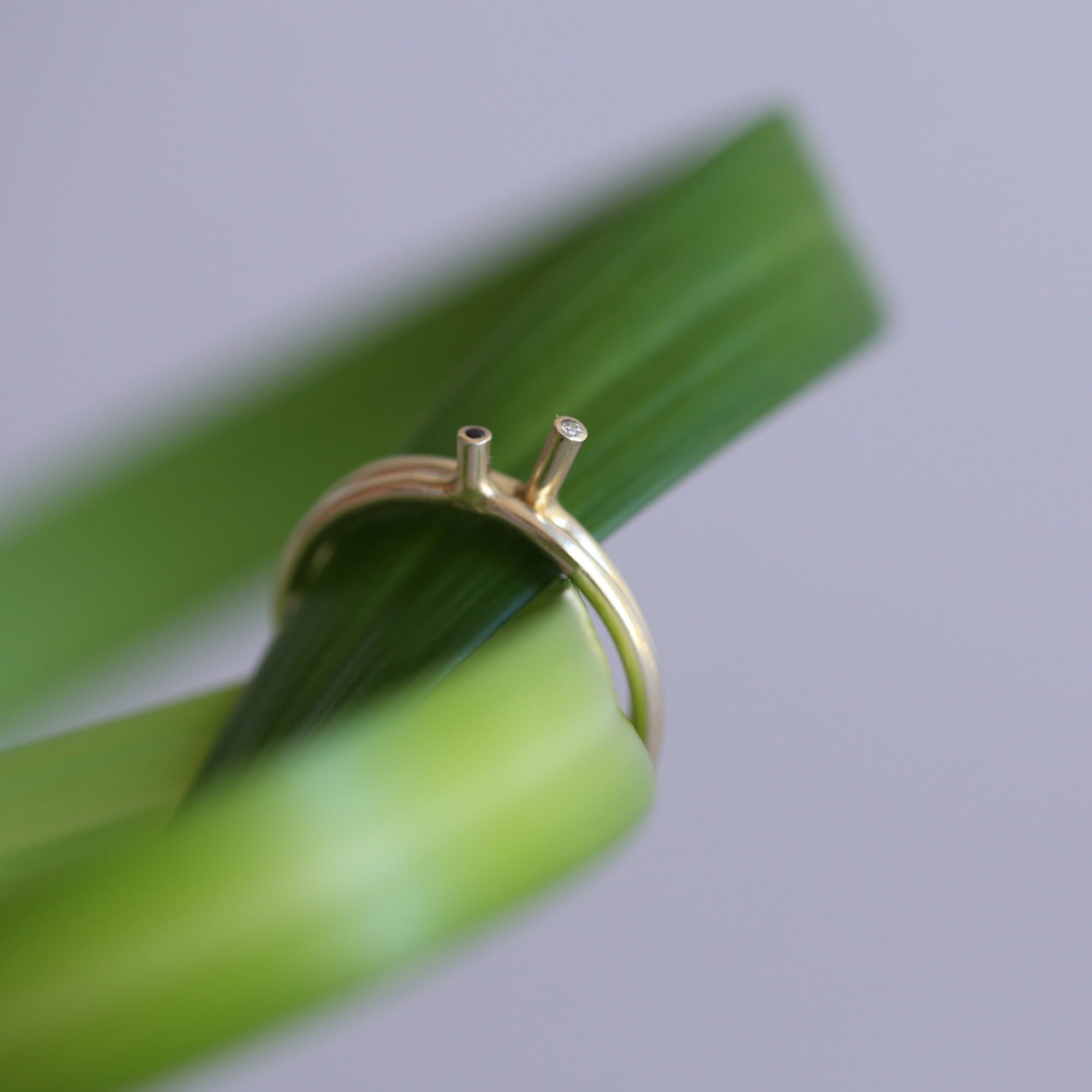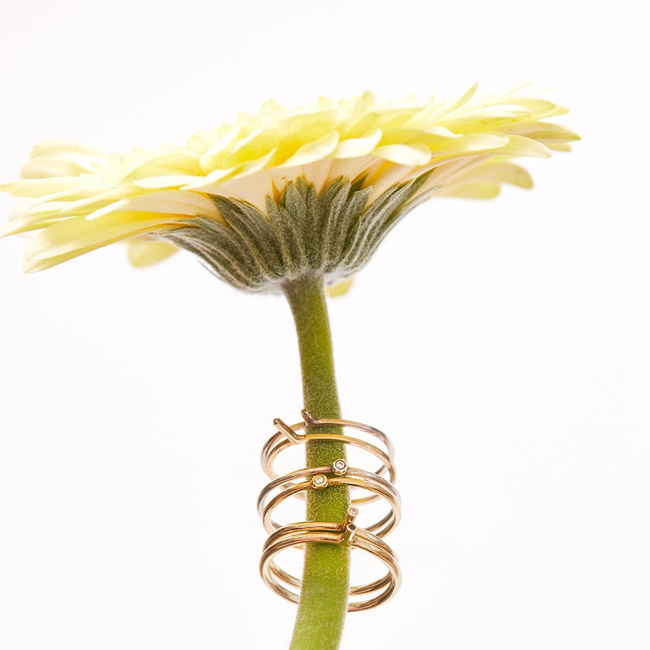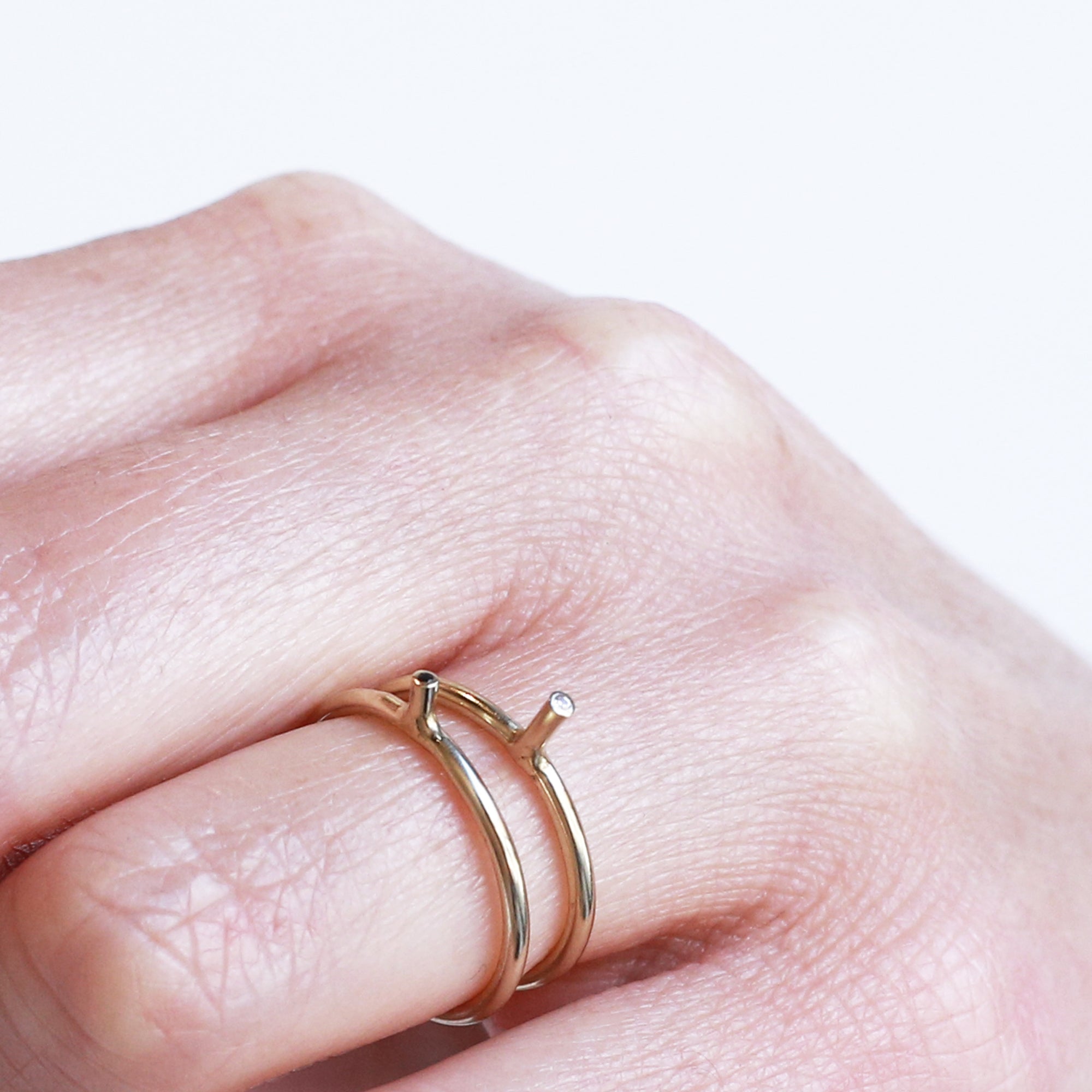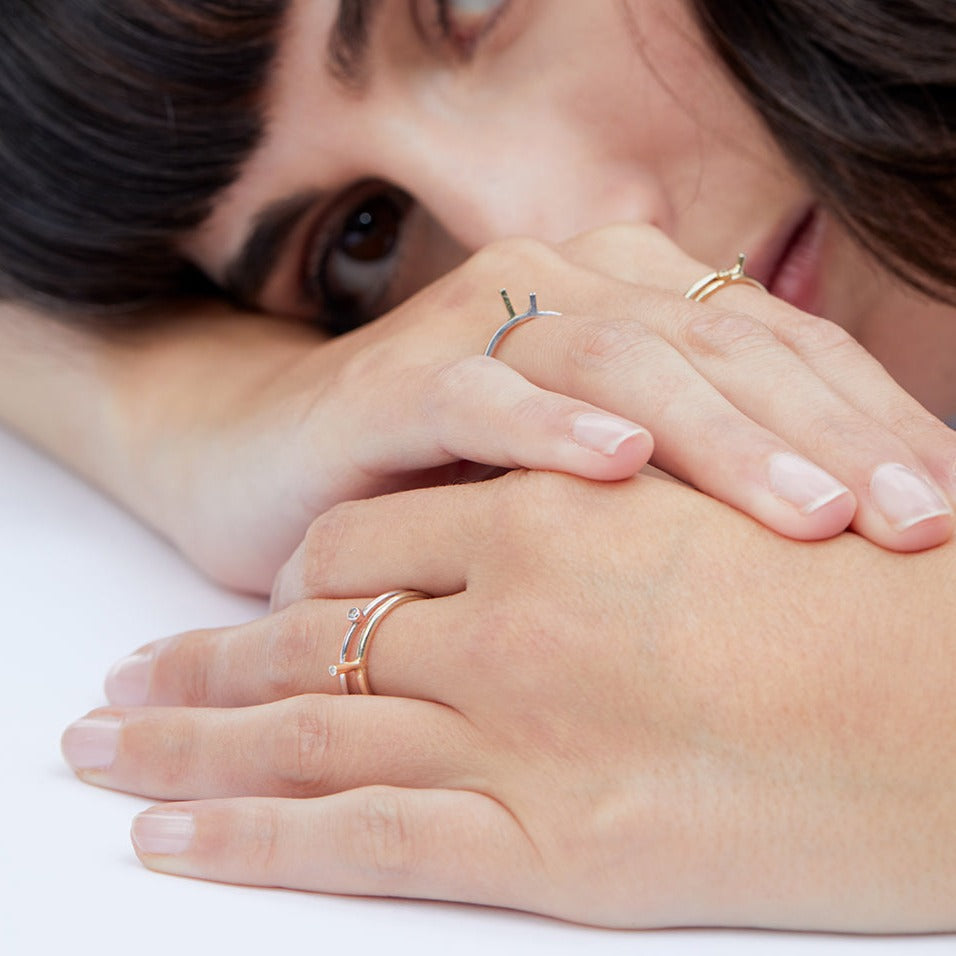 טבעות זהב עדינות עם נקודת יהלום מוגבהת בפרופיל עגול, טבעת אחת עם יהלום לבן והשניה עם יהלום שחור.