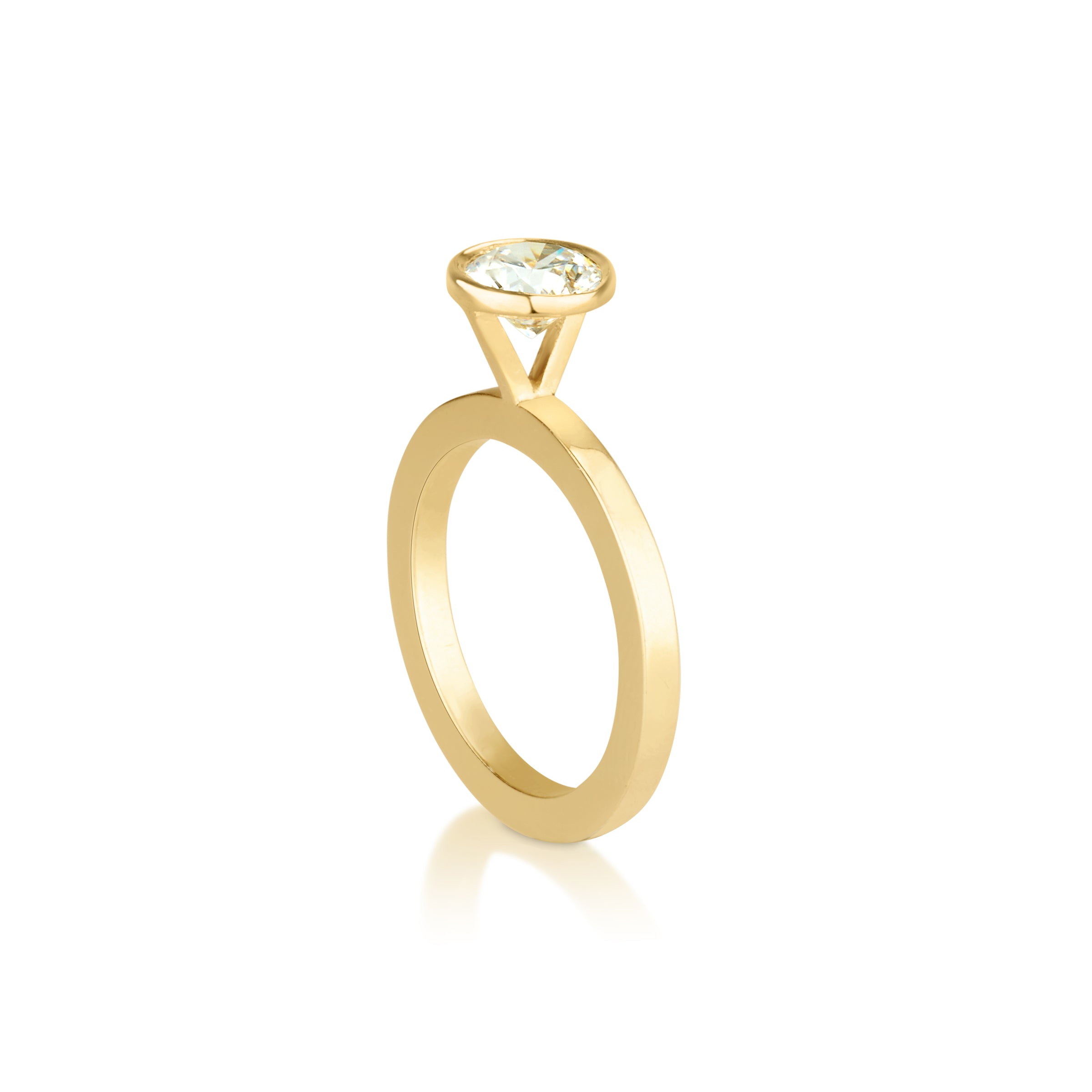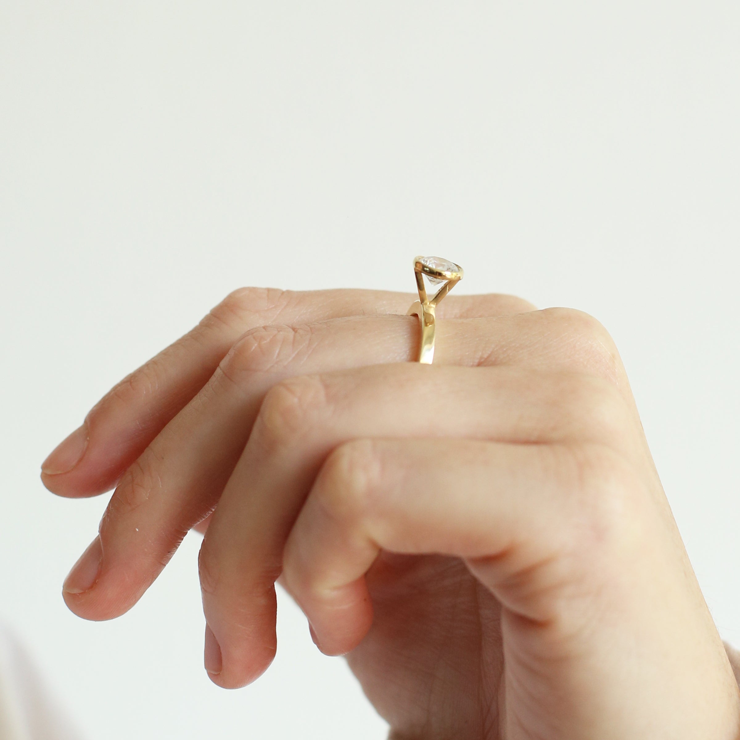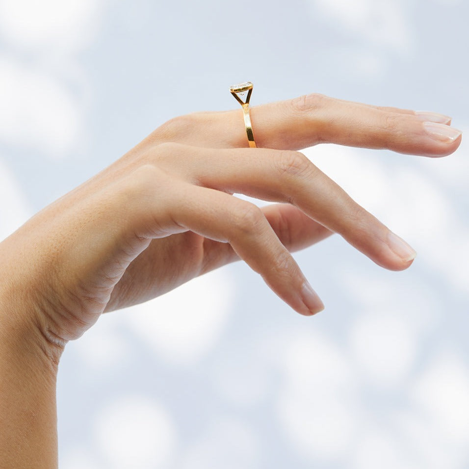 טבעת אירוסין גיאומטרית עם יהלום מרחף הממוקם בדיוק בראש הקונוס. טבעת אלגנטית המעוצבת בקפידה בעבודת יד.