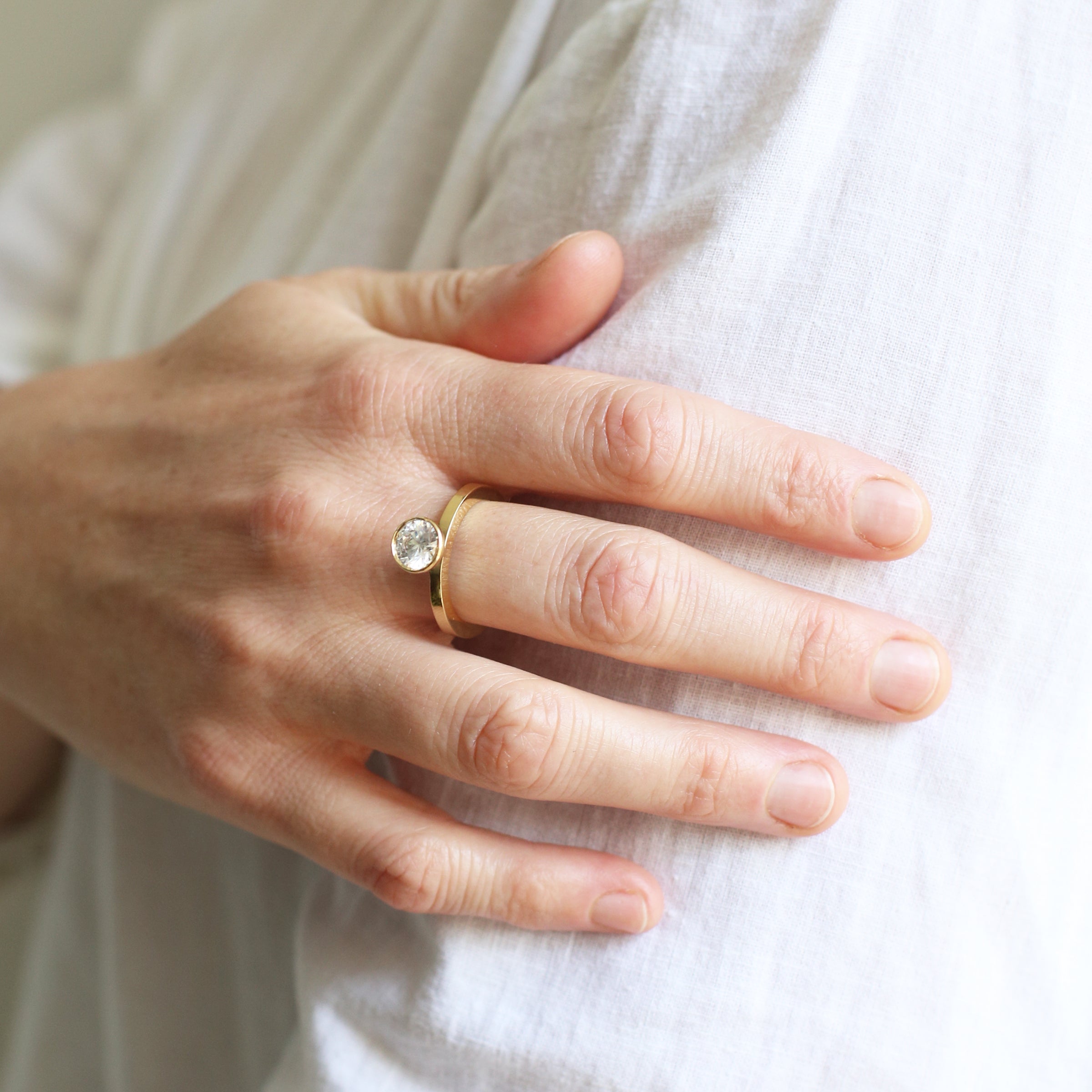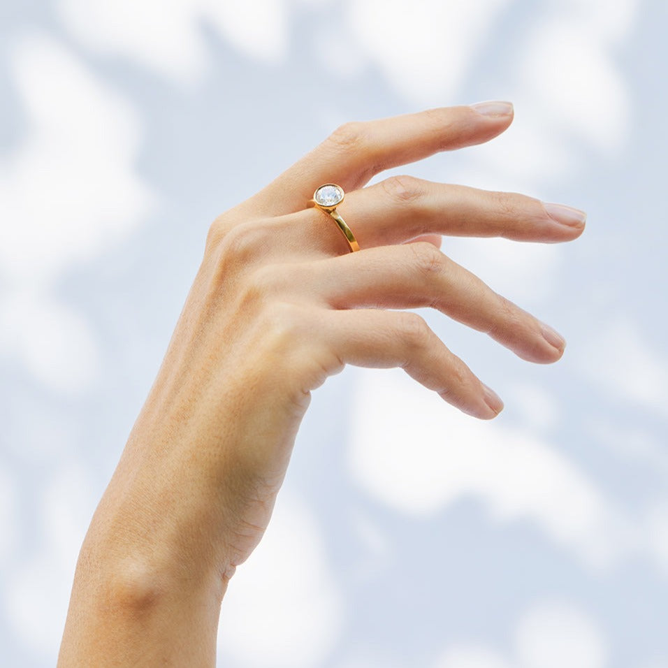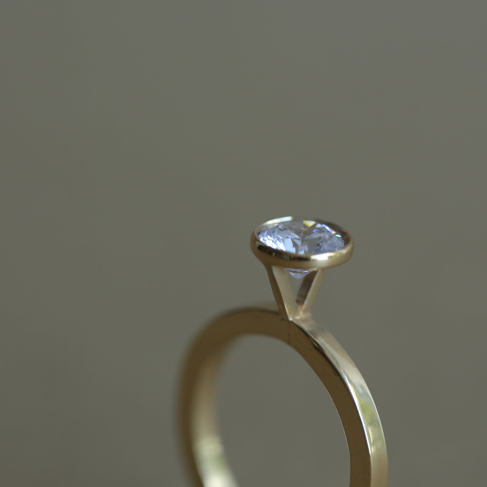 טבעת אירוסין גיאומטרית עם יהלום מרחף הממוקם בדיוק בראש הקונוס. טבעת אלגנטית המעוצבת בקפידה בעבודת יד.
