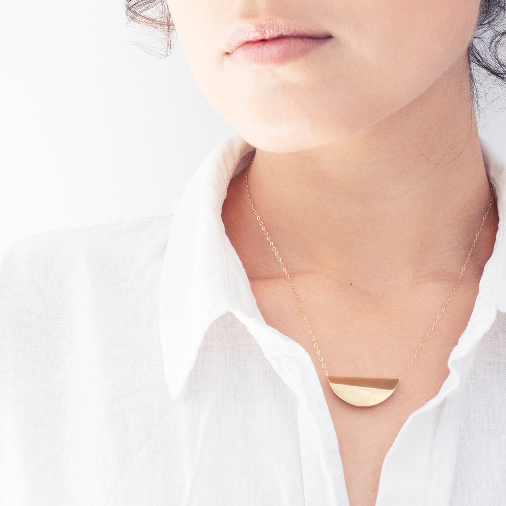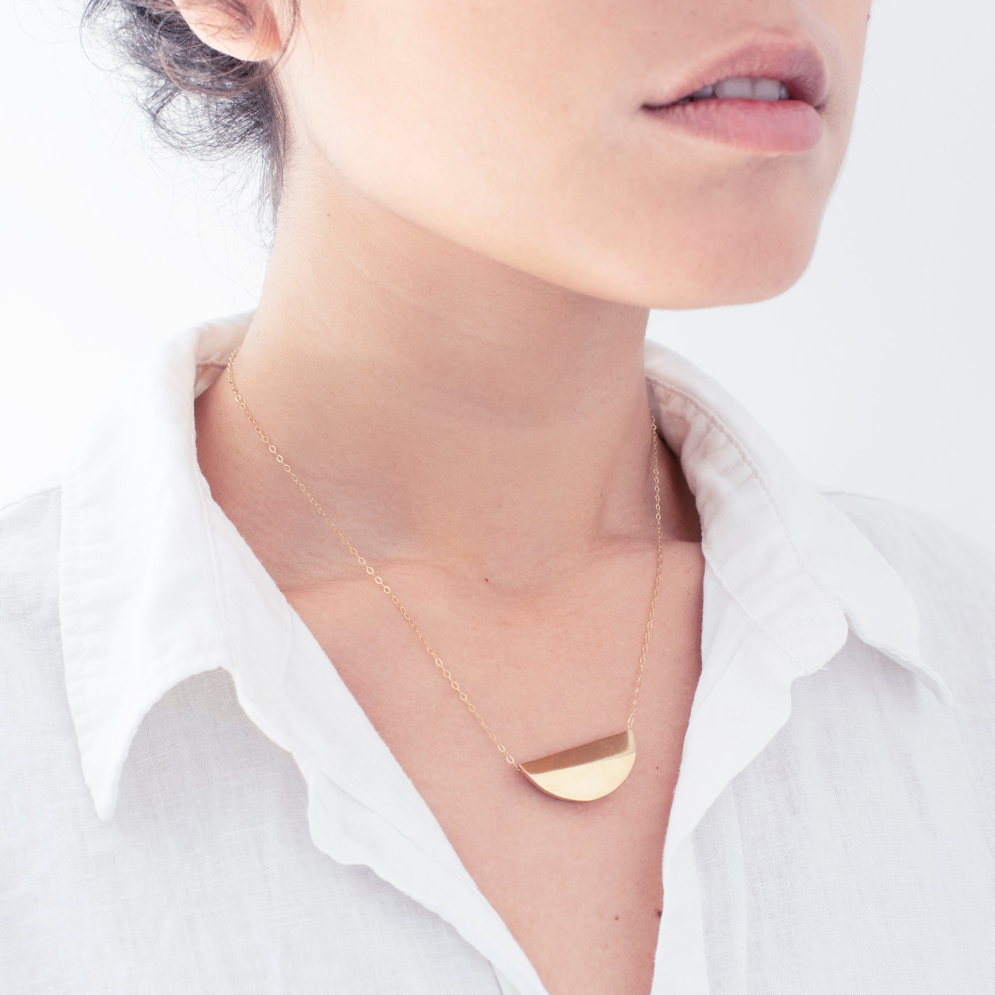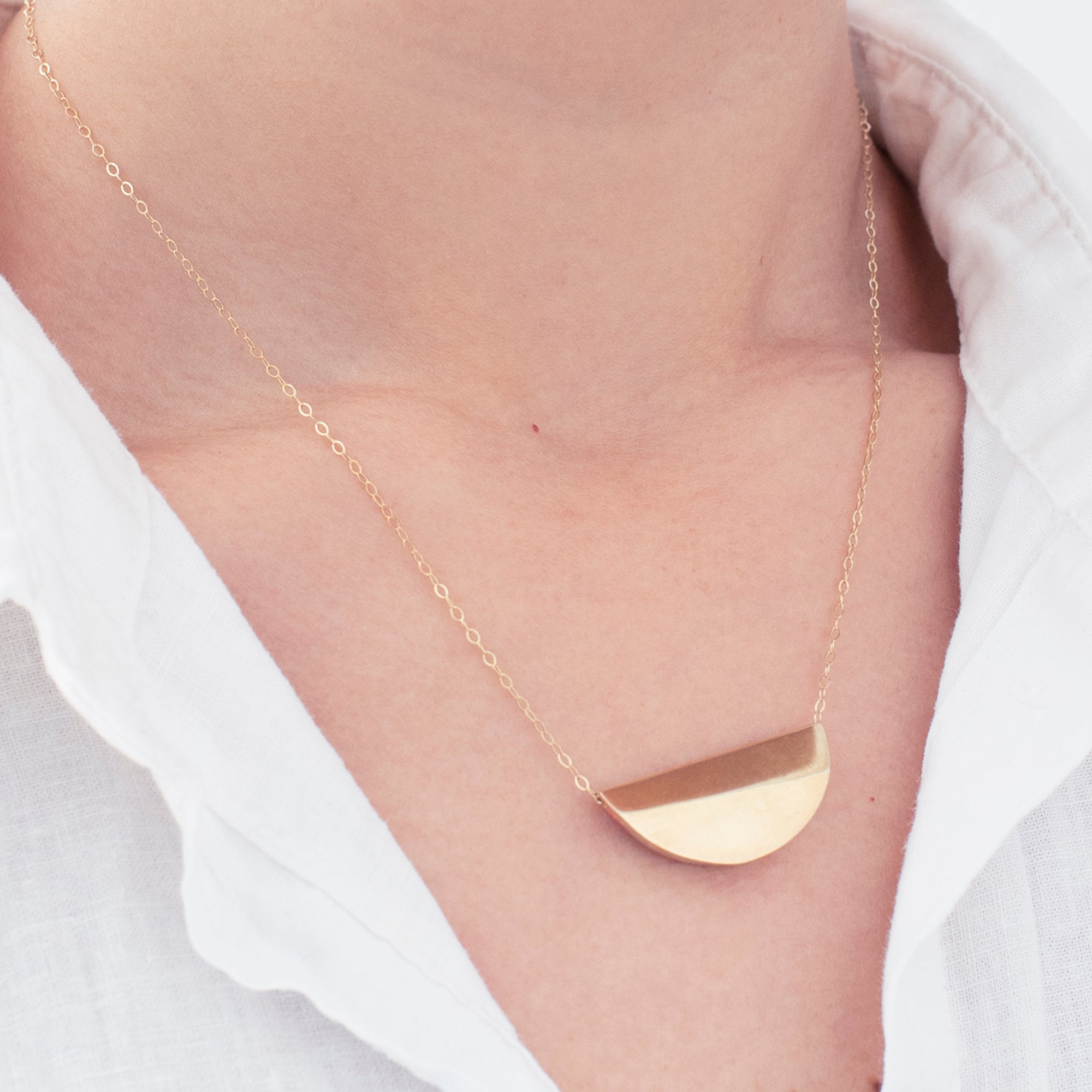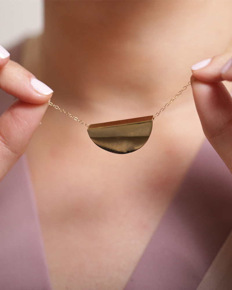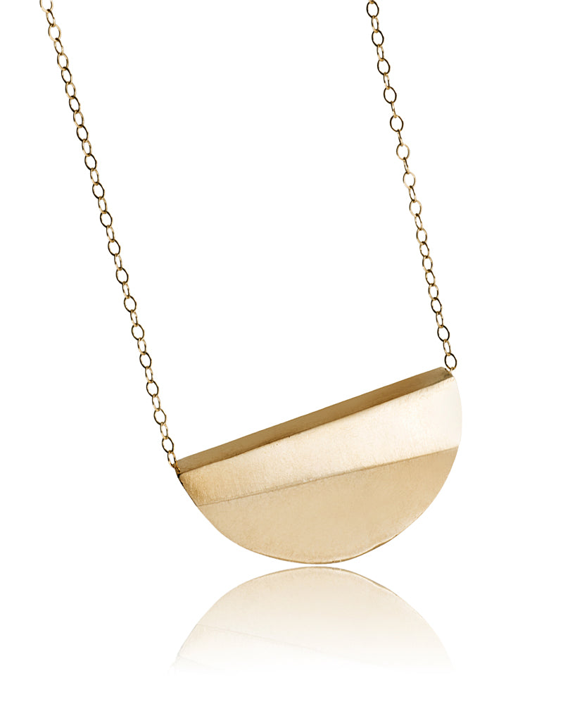 שרשרת זהב או כסף עם תליון גיאומטרי בצורת ירח. שרשרת ייחודית עם נוכחות, מעוצבת בקפידה בעבודת יד.