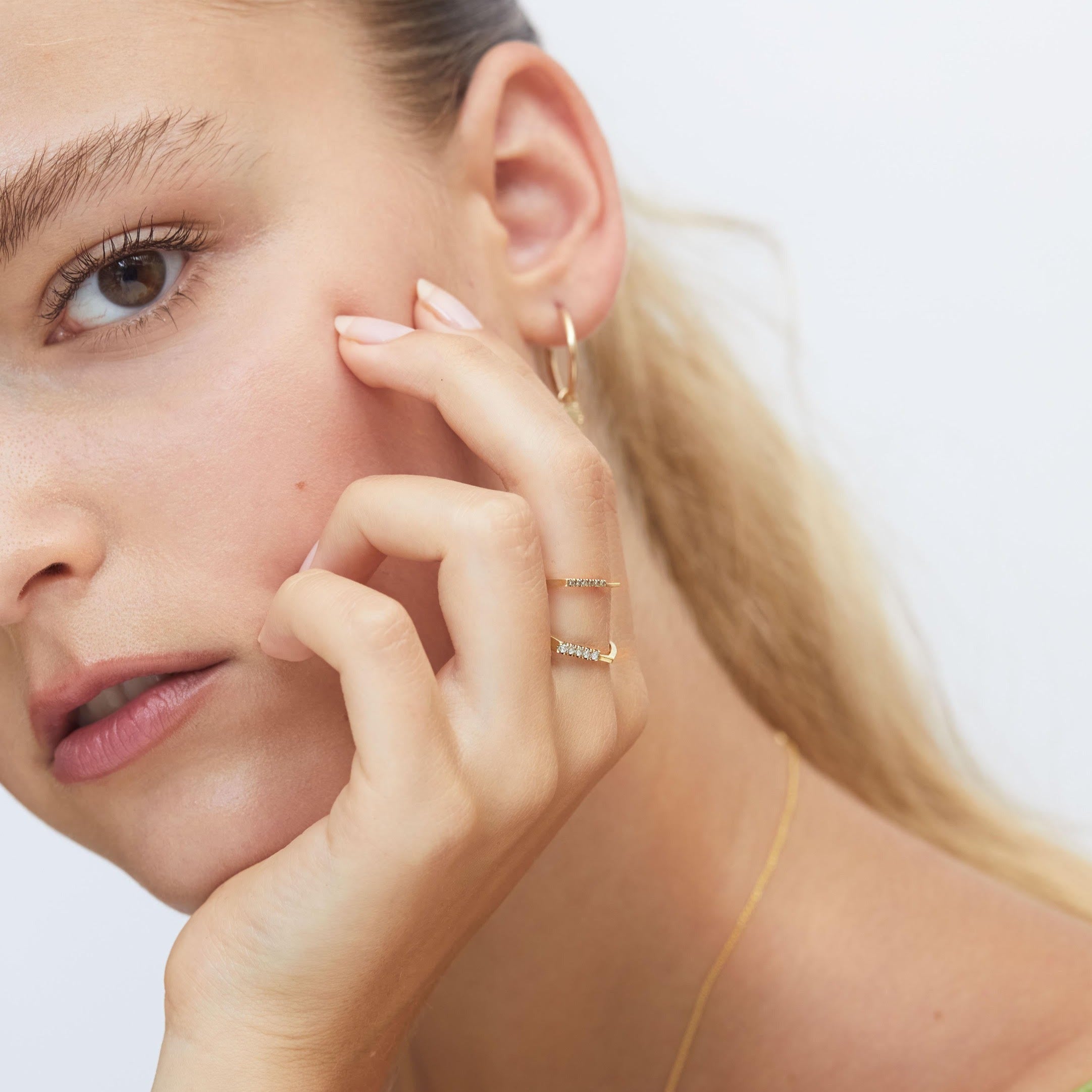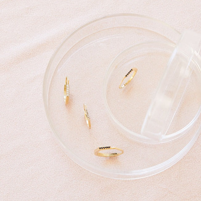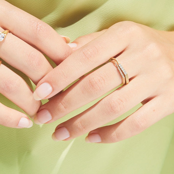 טבעת זהב גיאומטרית עדינה אסימטרית עם פס יהלומים בפרופיל מרובע. טבעת אלגנטית המעוצבת בקפידה בעבודת יד. מושלמת עם טבעת זהה נוספת.