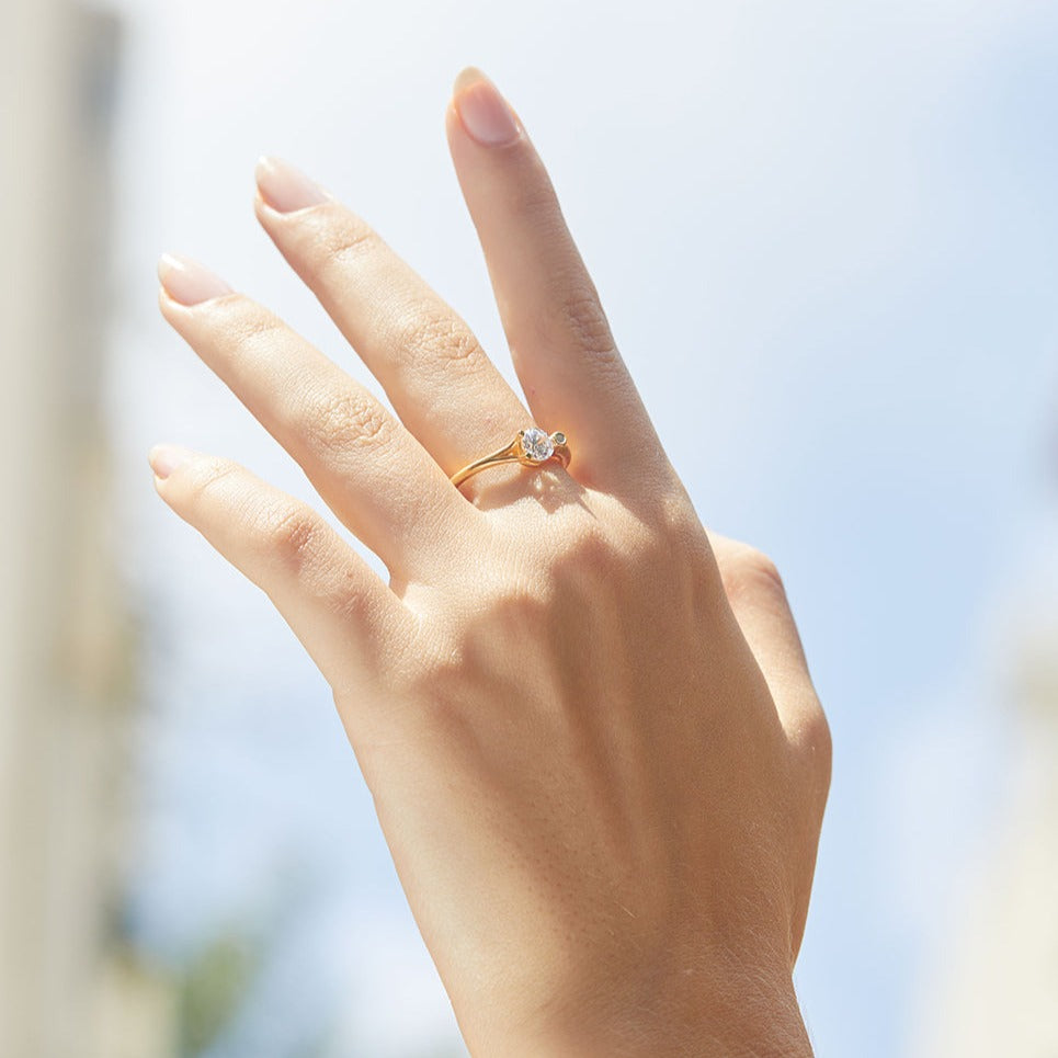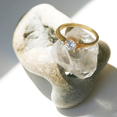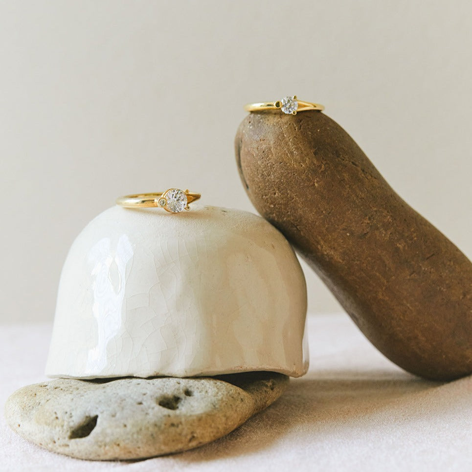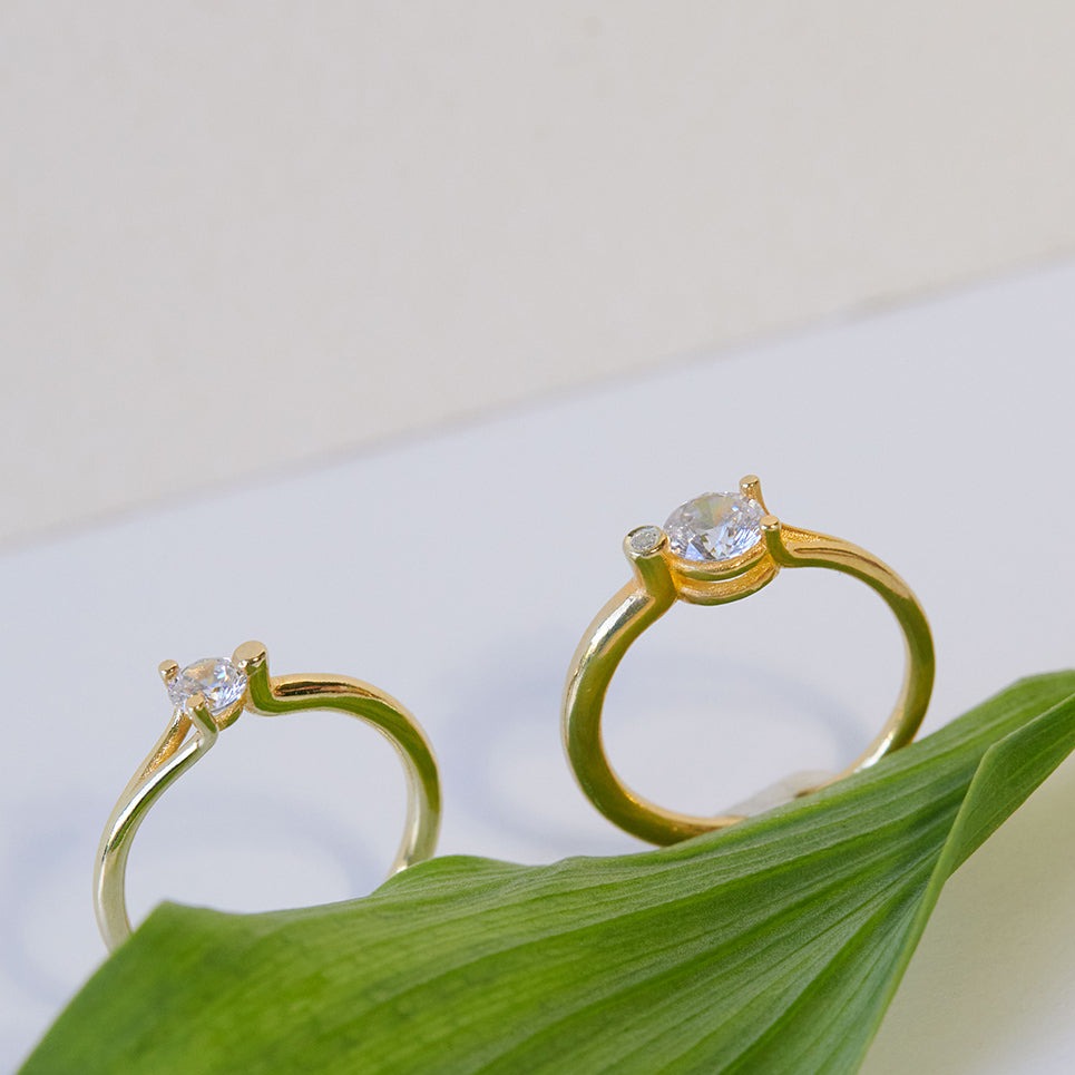 טבעת אירוסין במראה א-סימטרי שבו ה״שן״ הכי עבה ממשיכה את הקו והופכת להיות הטבעת עצמה