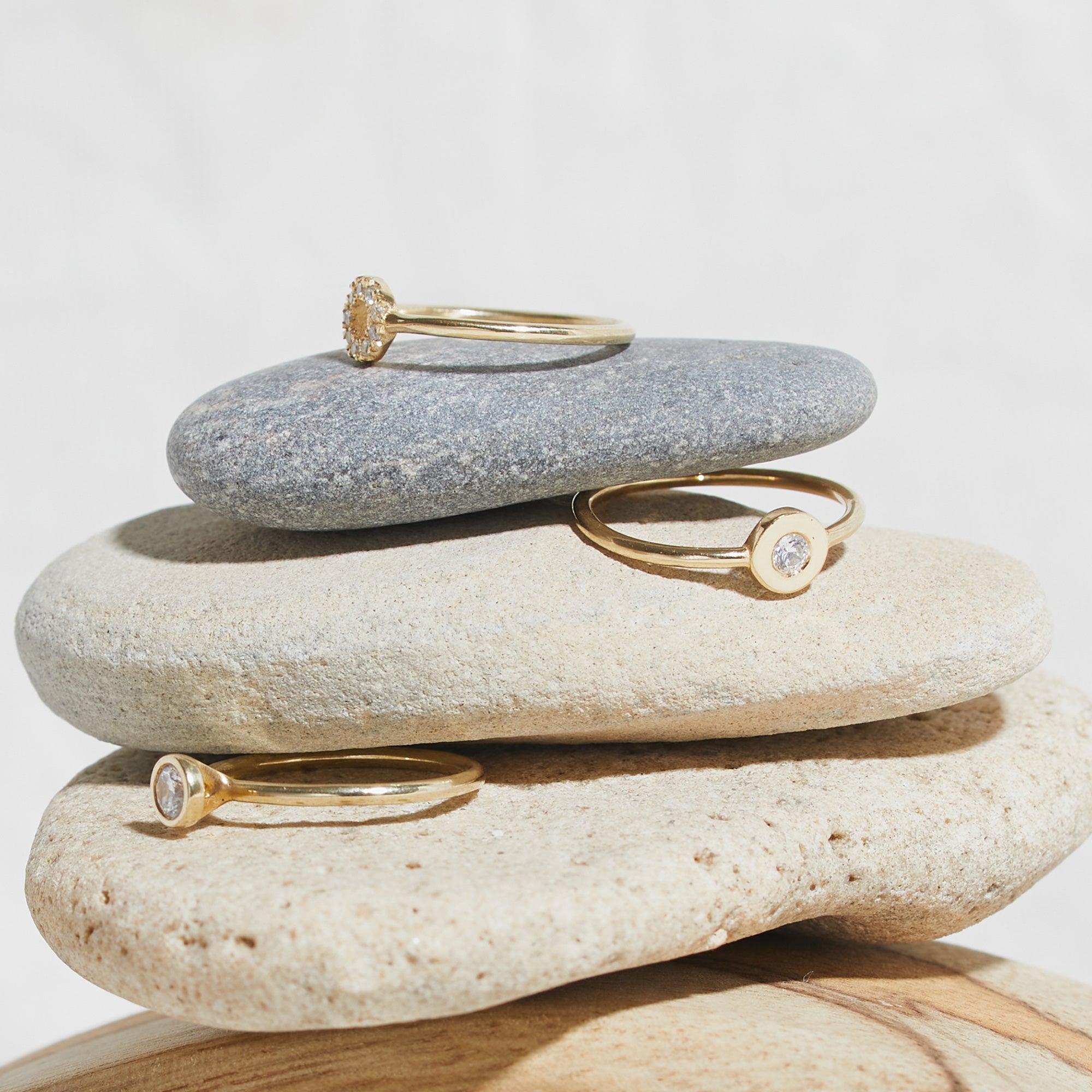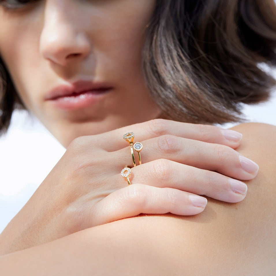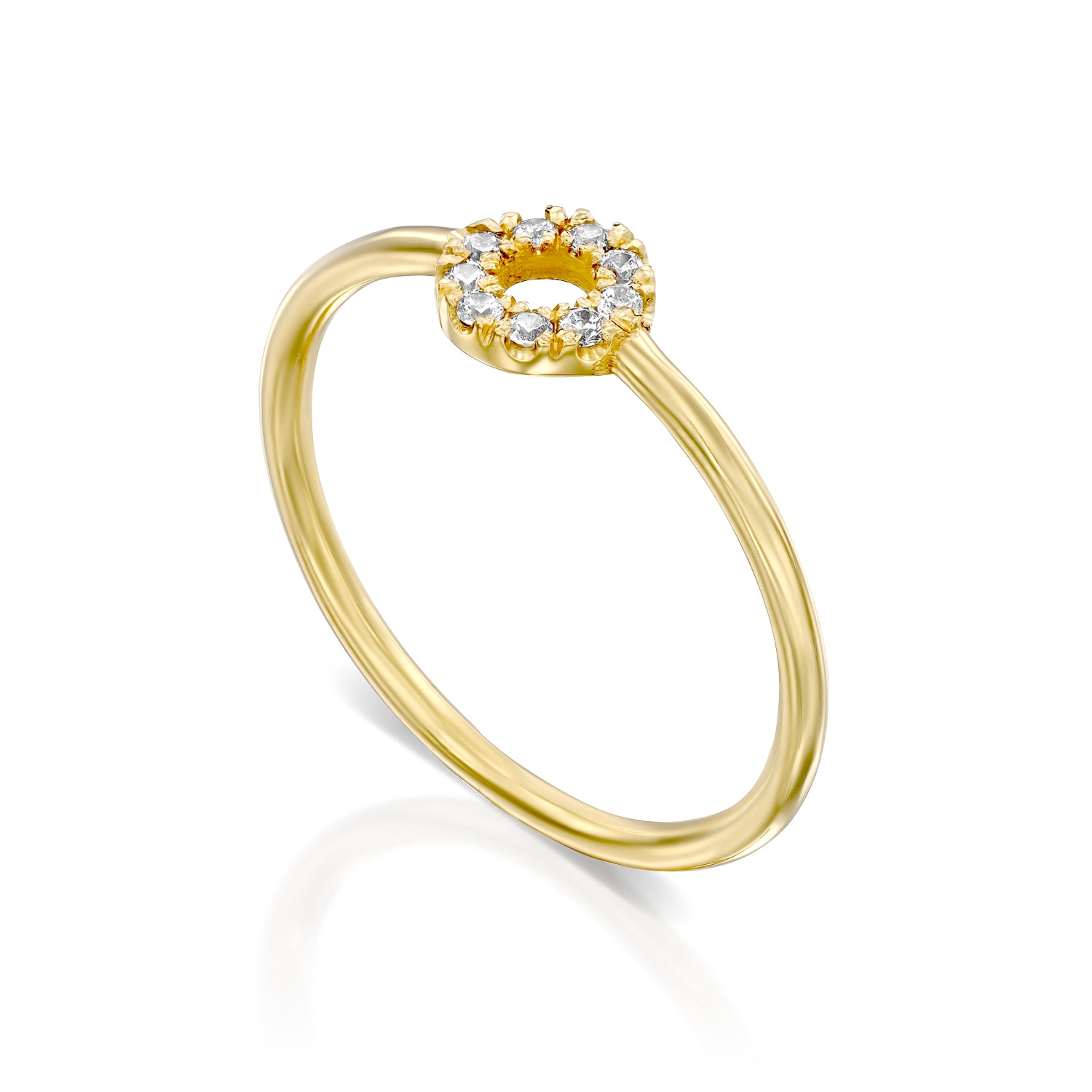 טבעת אירוסין עם סלסלת יהלומים לבנים מרחפים הממוקמים בדיוק בראש הקונוס. טבעת אלגנטית המעוצבת בקפידה בעבודת יד.